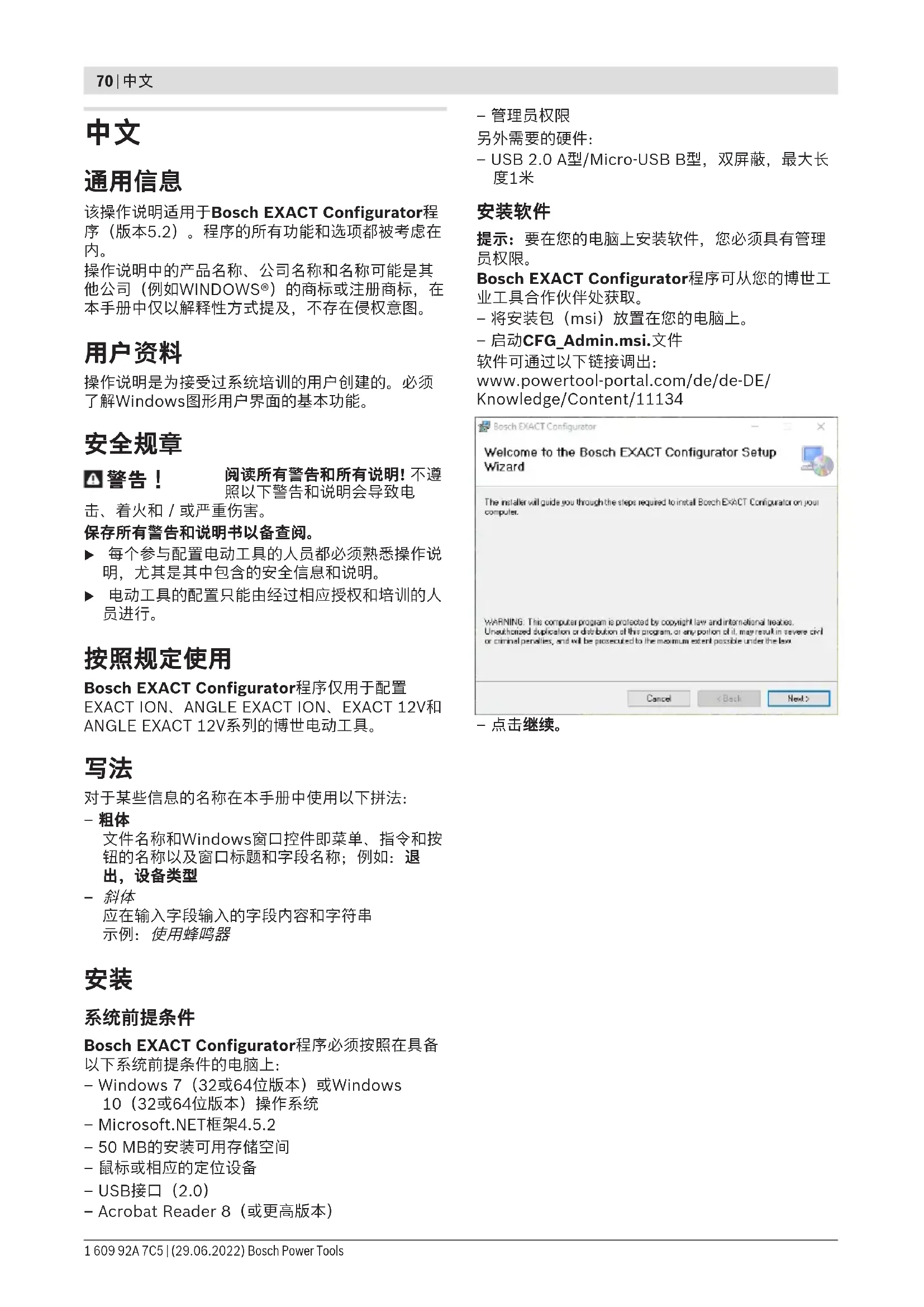 Bosch EXACT Configurator程序仅用于配置EXACTION、ANGLE EXACTION、EXACT12V和ANGLE EXACT12V系列的博世电动工具。 对于某些信息的名称在本手册中使用以下拼法:– 粗体文件名称和Windows窗口控件即菜单、指令和按钮的名称以及窗口标题和字段名称;例如:退出,设备类型– 应在输入字段输入的字段内容和字符串