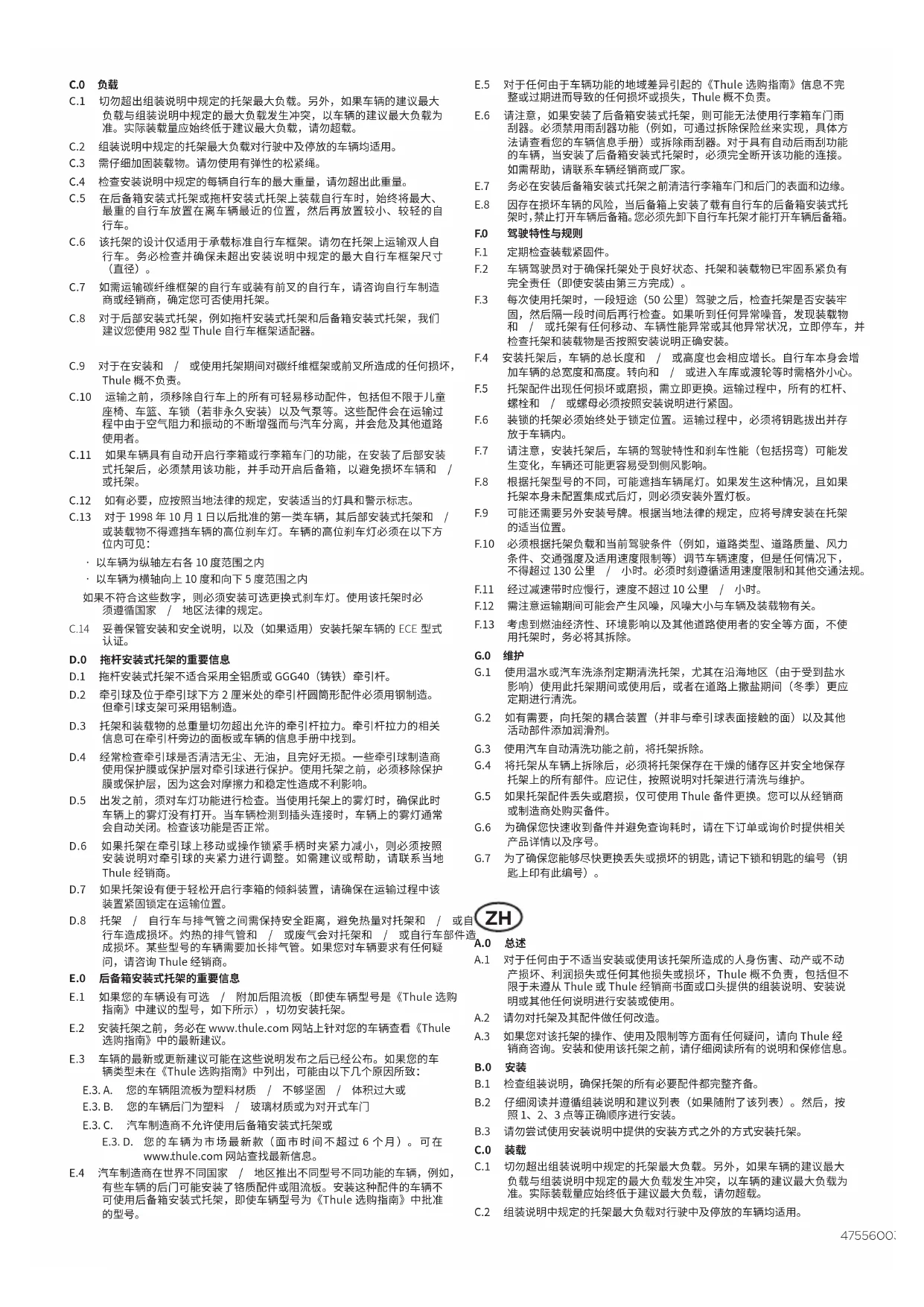 A.0 总述 A.1 对于任何由于不适当安装或使用该托架所造成的人身伤害、动产或不动 产损坏、利润损失或任何其他损失或损坏,Thule概不负责,包括但不 限于未遵从Thule或Thule经销商书面或口头提供的组装说明、安装说 明或其他任何说明进行安装或使用。 A.2 请勿对托架及其配件做任何改造。 A.3 如果您对该托架的操作、使用及限制等方面有任何疑问,请向Thule经 销商咨询。安装和使用该托架之前,请仔细阅读所有的说明和保修信息。 B.0 安装 B.1 检查组装说明,确保托架的所有必要配件都完整齐备。 B.2 仔细阅读并遵循组装说明和建议列表(如果随附建议列表)。然后,按 照1、2、3点等正确顺序进行安装。 B.3 请勿尝试使用安装说明中提供的安装方式之外的方式安装托架。475560032001 C.0 负载 C.1 切勿超出组装说明中规定的托架最大负载。另外,如果车辆的建议最大 负载与组装说明中规定的最大负载发生冲突,以车辆的建议最大负载为 准。实际装载量应始终低于建议最大负载,请勿超载。 C.2 组装说明中规定的托架最大负载对行驶中及停放的车辆均适用。 C.3 需仔细加固装载物。请勿使用有弹性的松紧绳。 C.4 检查安装说明中规定的每辆自行车的最大重量,请勿超出此重量。 C.5 在后备箱安装式托架或拖杆安装式托架上装载自行车时,始终将最大、 最重的自行车放置在离车辆最近的位置,然后再放置较小、较轻的自
