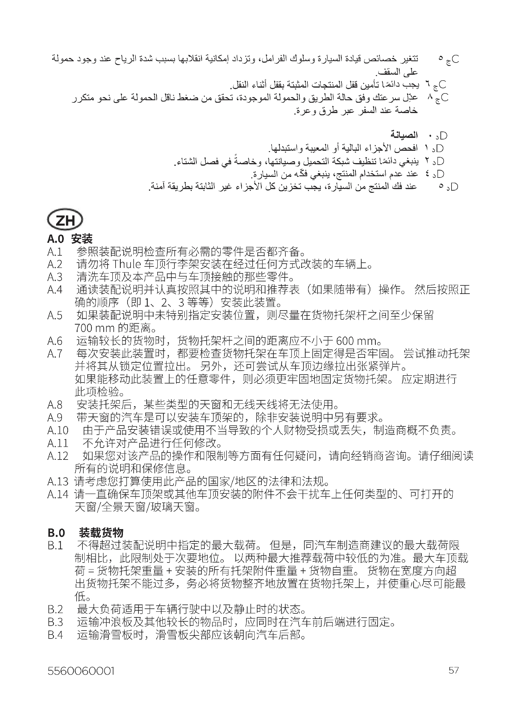 A.0 安装 A.1 参照装配说明检查所有必需的零件是否都齐备。 A.2 请勿将Thule车顶行李架安装在经过任何方式改装的车辆上。 A.3 清洗车顶及本产品中与车顶接触的那些零件。 A.4 通读装配说明并认真按照其中的说明和推荐表(如果随带有)操作。然后按照正 确的顺序(即1、2、3等等)安装此装置。 A.5 如果装配说明中未特别指定安装位置,则尽量在货物托架杆之间至少保留 700mm的距离。 A.6 运输较长的货物时,货物托架杆之间的距离应不小于600mm。 A.7 每次安装此装置时,都要检查货物托架在车顶上固定得是否牢固。尝试推动托架 并将其从锁定位置拉出。另外,还可尝试从车顶边缘拉出张紧弹片。 如果能移动此装置上的任意零件,则必须更牢固地固定货物托架。应定期进行