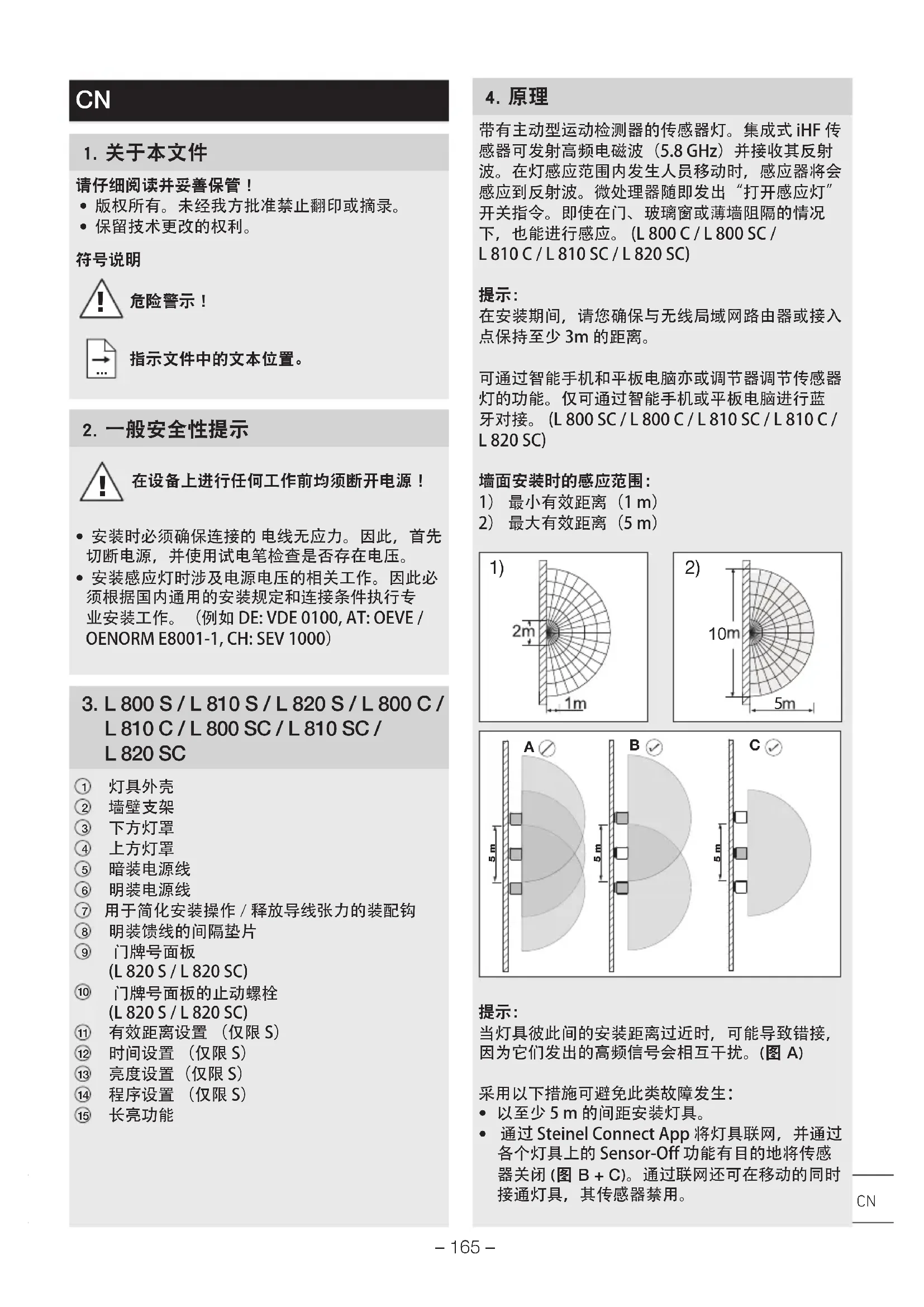 4.原理 带有主动型运动检测器的传感器灯。集成式 iHF 传感器可发射高频电磁波(5.8 GHz)并接收其反射波。在灯感应范围内发生人员移动时,感应器将会感应到反射波。微处理器随即发出“打开感应灯”开关指令。即使在门、玻璃窗或薄墙阻隔的情况下,也能进行感应。 (L 800 C / L 800 SC / L 810 C / L 810 SC / L 820 SC) 在安装期间,请您确保与无线局域网路由器或接入点保持至少 3m 的距离。可通过智能手机和平板电脑亦或调节器调节传感器灯的功能。仅可通过智能手机或平板电脑进行蓝牙对接。 (L 800 SC / L 800 C / L 810 SC / L 810 C / L 820 SC)墙面安装时的感应范围:1) 最小有效距离(1 m)2) 最大有效距离(5 m)