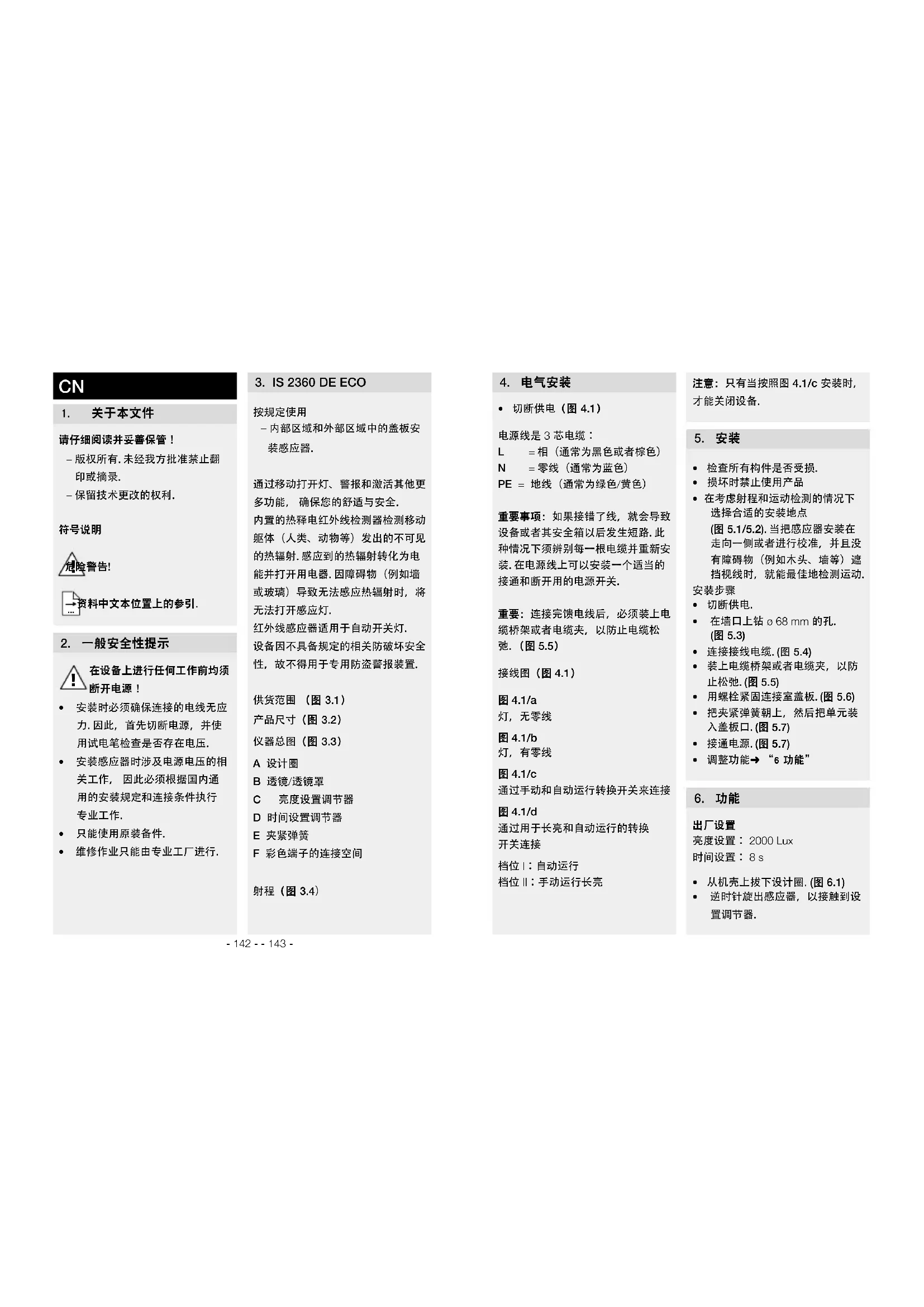 360° 有效距离 最大 4 m时间设置 8 秒 - 35 分钟亮度设置 2 至 2000 Lux IP 54 - 20 °C bis + 40 °C- 146 -