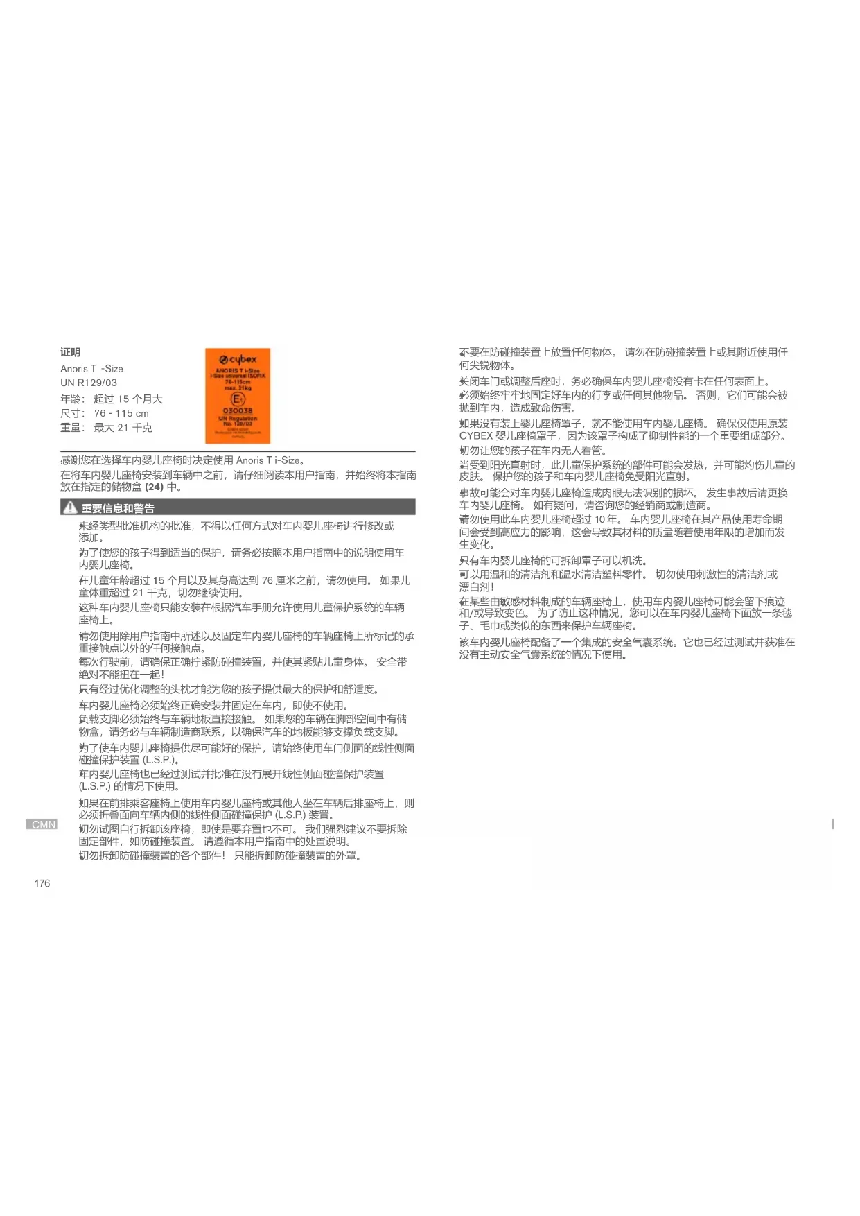 這是一款 i 號增強型兒童保護系統。 它是根據聯合國 R129/03 號法規批准的, 可用于車輛製造商在車輛用戶手冊中指示的 i 號相容型車輛座椅位置。 如果您的 車輛沒有 i 號座椅位置,請檢查隨附的車輛類型列表,核對是否允許使用。 您可以從 www.cybex-online.com 上獲取最新版類型列表。 如果您的車輛未配備 ISOFIX,則不能使用車內嬰兒座椅。 如果您的車輛沒有足夠的空間,可以將線性側面碰撞保護裝置 (L.S.P) 折疊起