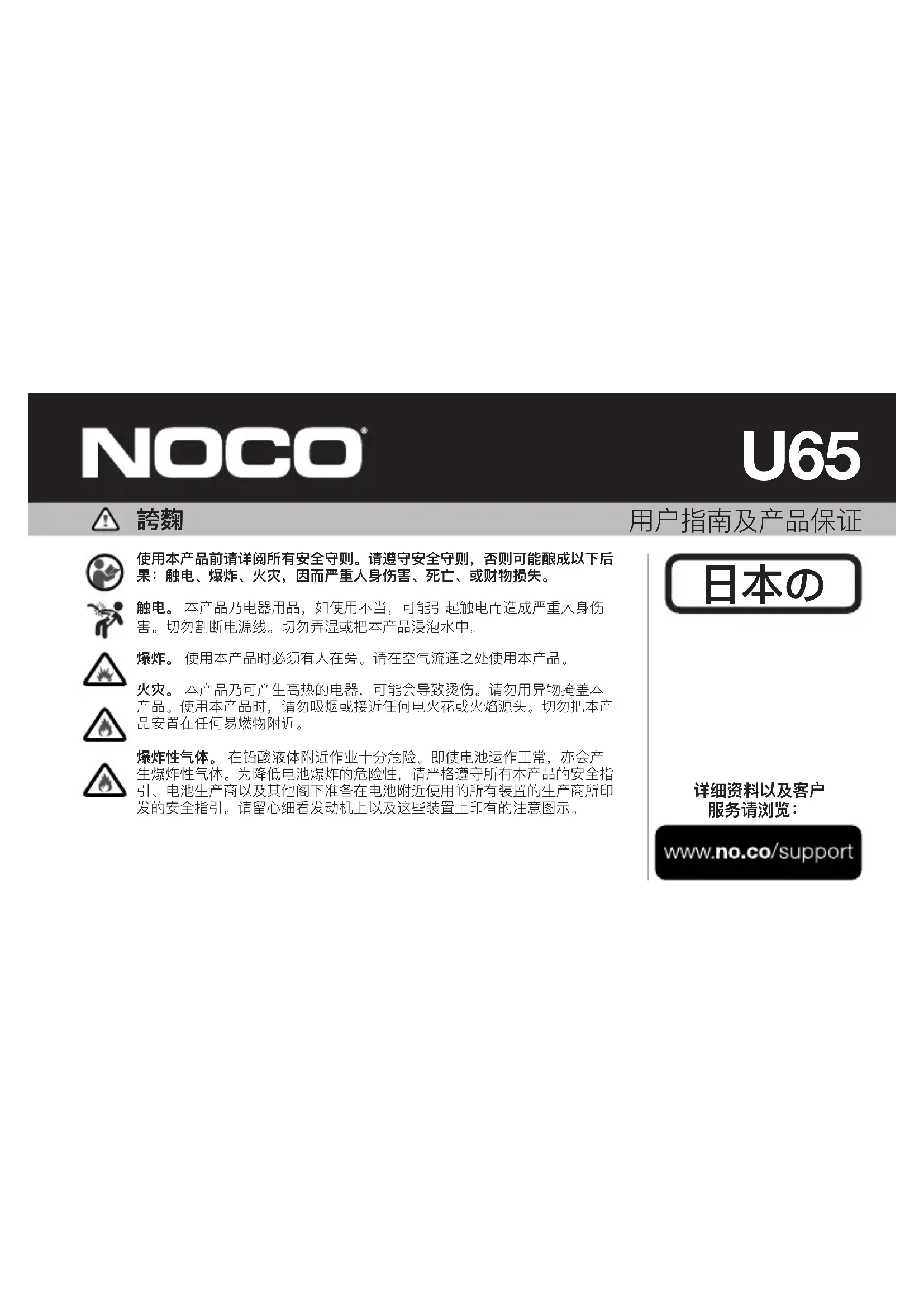 日本の【加州65号提案】 本产品可能使您暴露在加州已声明可致癌和致畸,可导致其他生殖危害的化学品中。 适配器。 本产品 额定电压 100-240V,50-60Hz,包括四种适配器:Type A(美国),Type C(欧洲),Type G(英国)以及 Type I( 澳大利亚),因地理位置不同而有所不同。使用本产品前,请选择合适您所在地区的适配器。 个人使用注意事项。 本产品 不得超范围使用。应有人在您的呼救范围内,或者能够就近提供帮助,以防出现紧急情况。 未成年使用者。 若“买方”购买 本产品供未成年人使用,则购买本品的成年人同意在未成年人使用前向其提供详细的操作说明和警告。未尽责的后果由“买 方”承担,“买方”同意免除因未成年人乱用或误用本品而向 NOCO 索取赔偿。 窒息危险。 本产品配件有潜在儿童窒息危 险。切勿在没有成年人监管的情况下让儿童接触本产品及任何配件。本产品并非玩具。 处理。 正常使用时,本产品可能 会很烫。长时间接触发热的表面可能会造成皮肤不适或损伤。请务必保证电源适配器周围的通风顺畅,拿取时请小心。电 源适配器接通电源时,请勿将其放在毯子、枕头或您的身体下。电源适配器接通电源时,请注意不要长时间接触电源适配 器。若您的身体存在无法感受温度的问题,请特别注意。适配器插头、插片或外盒损坏时,请勿使用。电源线损坏时,请 勿使用。潮湿和液体可能会使本产品损坏。请勿将本产品或其他电子元件放在液体(如水池、浴池或淋浴器)旁。请在干 燥场所存放和使用本产品。本产品沾水时,请勿使用。若正在使用中的产品沾水了,请立即拔下适配器。请勿用沾水的手 插拔电源适配器。 改装。 请勿尝试改变,修改或维修本产品的任何部件.拆解产品可能会造成人身伤亡或财产损失。若本 产品已损坏,故障或进液,请停止使用并联系 NOCO。修改本产品将不提供质保。 配件。 本产品仅限搭配 NOCO 配件 使用。未使用 NOCO 认可的配件,对于用户安全或造成的损失,NOCO 概不负责。 使用地点。 不要在封闭区域或通风不 畅的地方使用本产品。 清洁。 尝试维护或清洁本产品前,请先拔下适配器。若本产品进液或进入污染物,请立即清洁并晾 干。使用柔软的无绒(超细纤维)布。避免开口处进液。 易爆气体环境。 请遵守所有的指示和使用说明。不要在可能存在 爆炸氛围的区域使用本产品,如加油区或空气中含有化学物质或微粒(如粉尘、灰尘或金属粉末)的地方。 高度危险性活 动。 若本产品的故障会造成人身伤亡或严重环境损害,则不得在此处使用。 使用 U65 65W USB-C 电源适配器和内含的 USB-C 线来为您的 NOCO Boost X UltraSafe 应急电源或其他 USB-C 设 备充电。将 USB-C 线与电源适配器连接,然后将电源适配器牢固地插在电源插座上。确保电源插座方便拔插。将 USB-C 线的另一端与您的 NOCO Boost X UltraSafe 应急电源或其他 USB-C 设备相连。