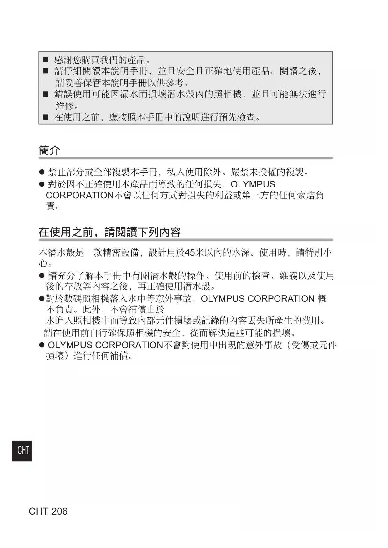 請充分了解本⼿冊中有關潛⽔殼的操作、使⽤前的檢查、維護以及使⽤ 後的存放等內容之後,再正確使⽤潛⽔殼。 對於數碼照相機落⼊⽔中等意外事故,OLYMPUS CORPORATION 概 不負責。此外,不會補償由於 ⽔進⼊照相機中⽽導致內部元件損壞或記錄的內容丟失所產⽣的費⽤。 請在使⽤前⾃⾏確保照相機的安全,從⽽解決這些可能的損壞。 OLYMPUS CORPORATION不會對使⽤中出現的意外事故(受傷或元件 損壞)進⾏任何補償。CHT 207 CHT