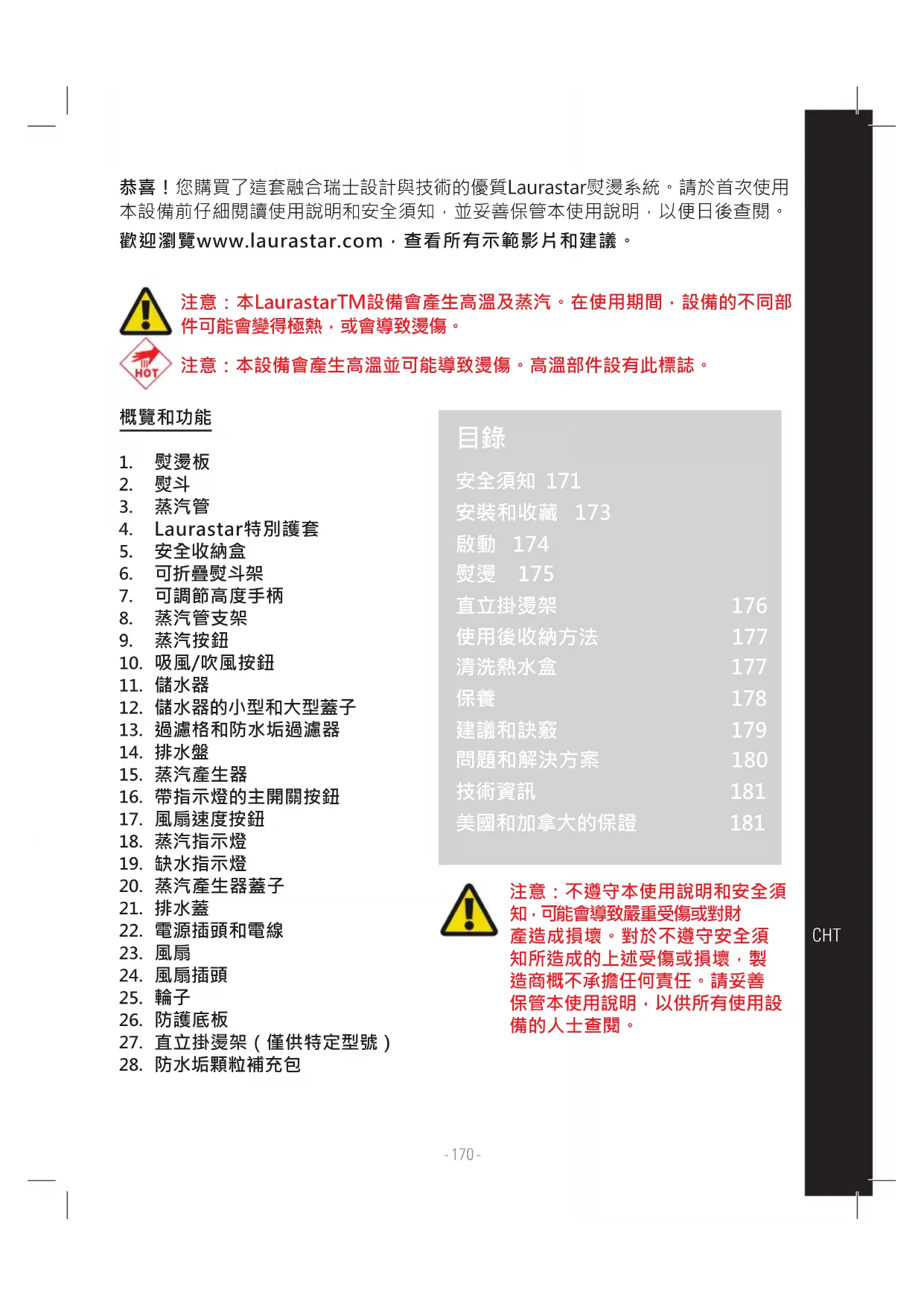 撥打 LAURASTAR 客戶服務中心諮詢具體操作事宜。 CHT- 181 -
