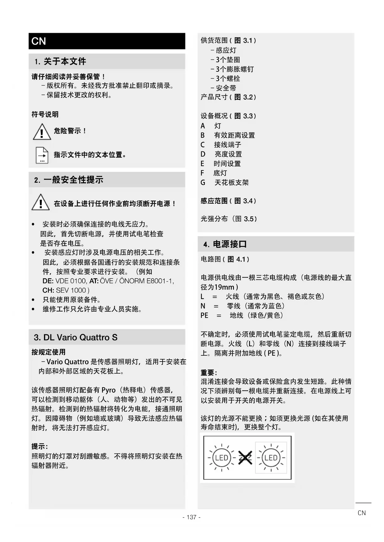 混淆连接会导致设备或保险盒内发生短路。此种情 况下须辨别每一根电缆并重新连接。在电源线上可 以安装用于开关的电源开关。 该灯的光源不能更换;如须更换光源(如在其使用 寿命结束时),更换整个灯。- 138 - 说明:每次关闭灯后,新的移动感应会中断约1秒 钟。该时间结束后,感应灯仅在感应到移动时亮 起。设置感应范围和进行功能测试时,建议设置