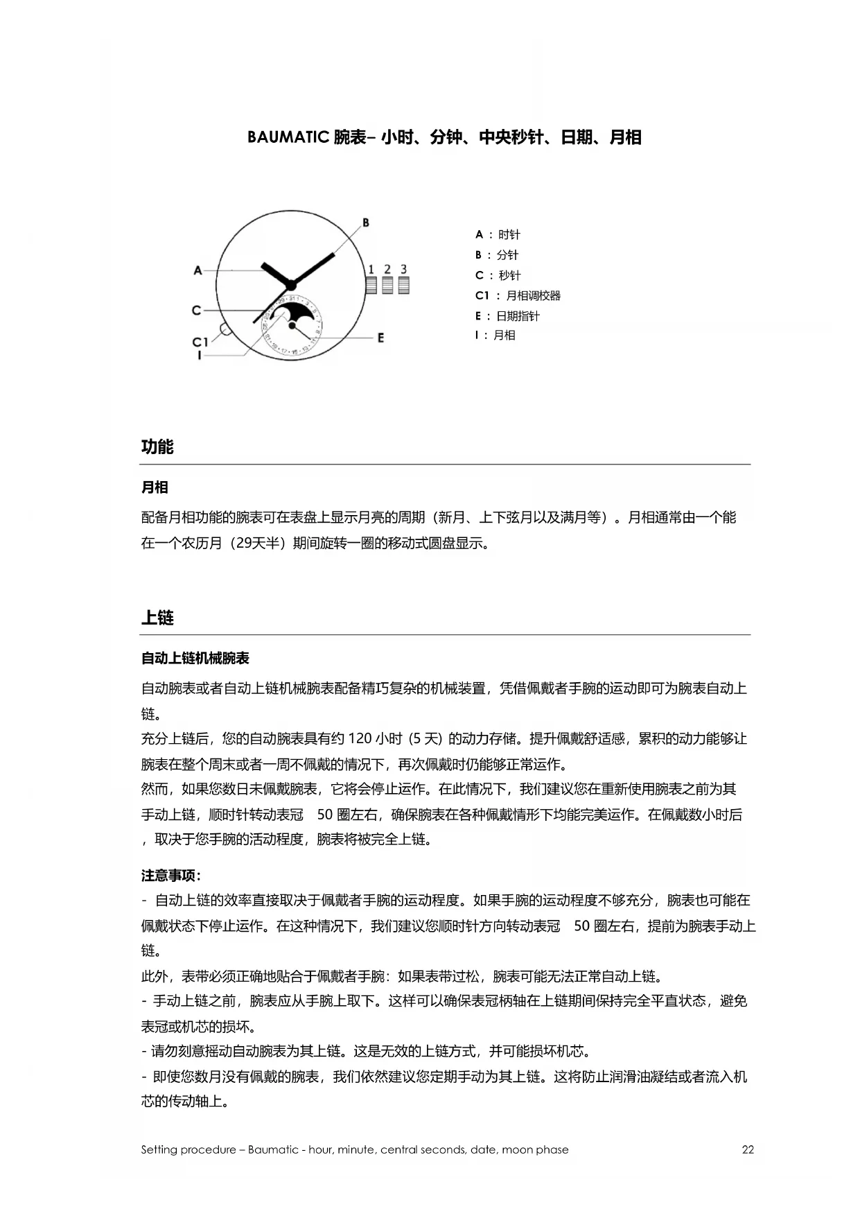 - 请勿刻意摇动自动腕表为其上链。这是无效的上链方式,并可能损坏机芯。 - 即使您数月没有佩戴的腕表,我们依然建议您定期手动为其上链。这将防止润滑油凝结或者流入机 芯的传动轴上。Setting procedure – Baumatic - hour, minute, central seconds, date, moon phase 23