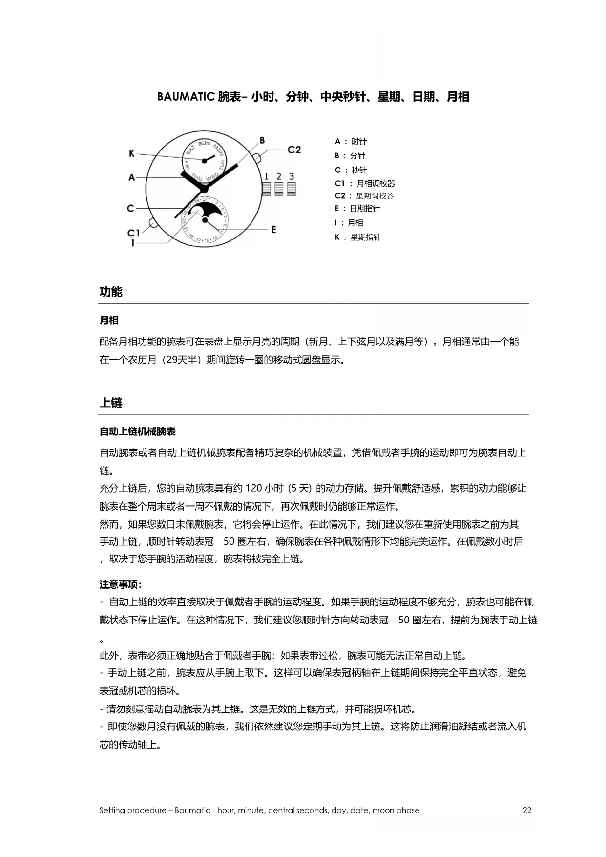 - 请勿刻意摇动自动腕表为其上链。这是无效的上链方式,并可能损坏机芯。 - 即使您数月没有佩戴的腕表,我们依然建议您定期手动为其上链。这将防止润滑油凝结或者流入机 芯的传动轴上。Setting procedure – Baumatic - hour, minute, central seconds, day, date, moon phase 23