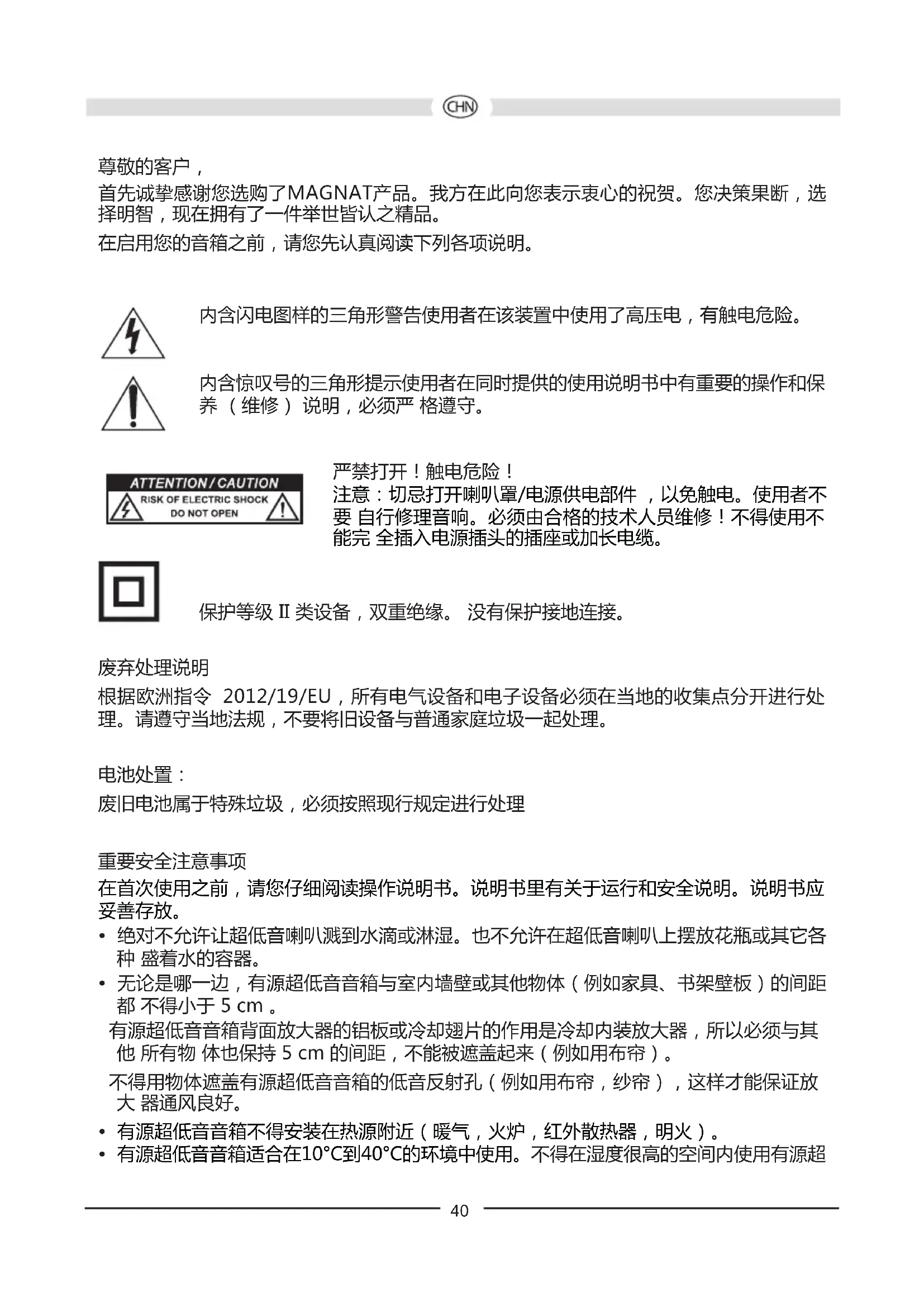 首先诚挚感谢您选购了MAGNAT产品。我方在此向您表示衷心的祝贺。您决策果断,选 择明智,现在拥有了一件举世皆认之精品。 在启用您的音箱之前,请您先认真阅读下列各项说明。 内含闪电图样的三角形警告使用者在该装置中使用了高压电,有触电危险。 内含惊叹号的三角形提示使用者在同时提供的使用说明书中有重要的操作和保 养 (维修) 说明,必须严 格遵守。