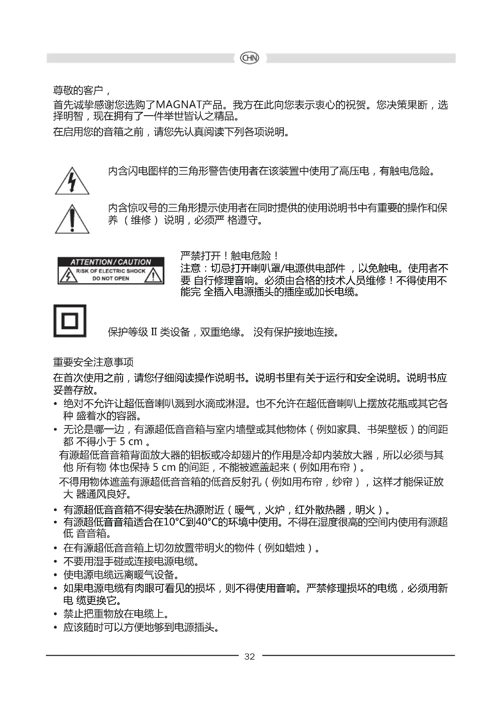 首先诚挚感谢您选购了MAGNAT产品。我方在此向您表示衷心的祝贺。您决策果断,选 择明智,现在拥有了一件举世皆认之精品。 在启用您的音箱之前,请您先认真阅读下列各项说明。 内含闪电图样的三角形警告使用者在该装置中使用了高压电,有触电危险。 内含惊叹号的三角形提示使用者在同时提供的使用说明书中有重要的操作和保 养 (维修) 说明,必须严 格遵守。