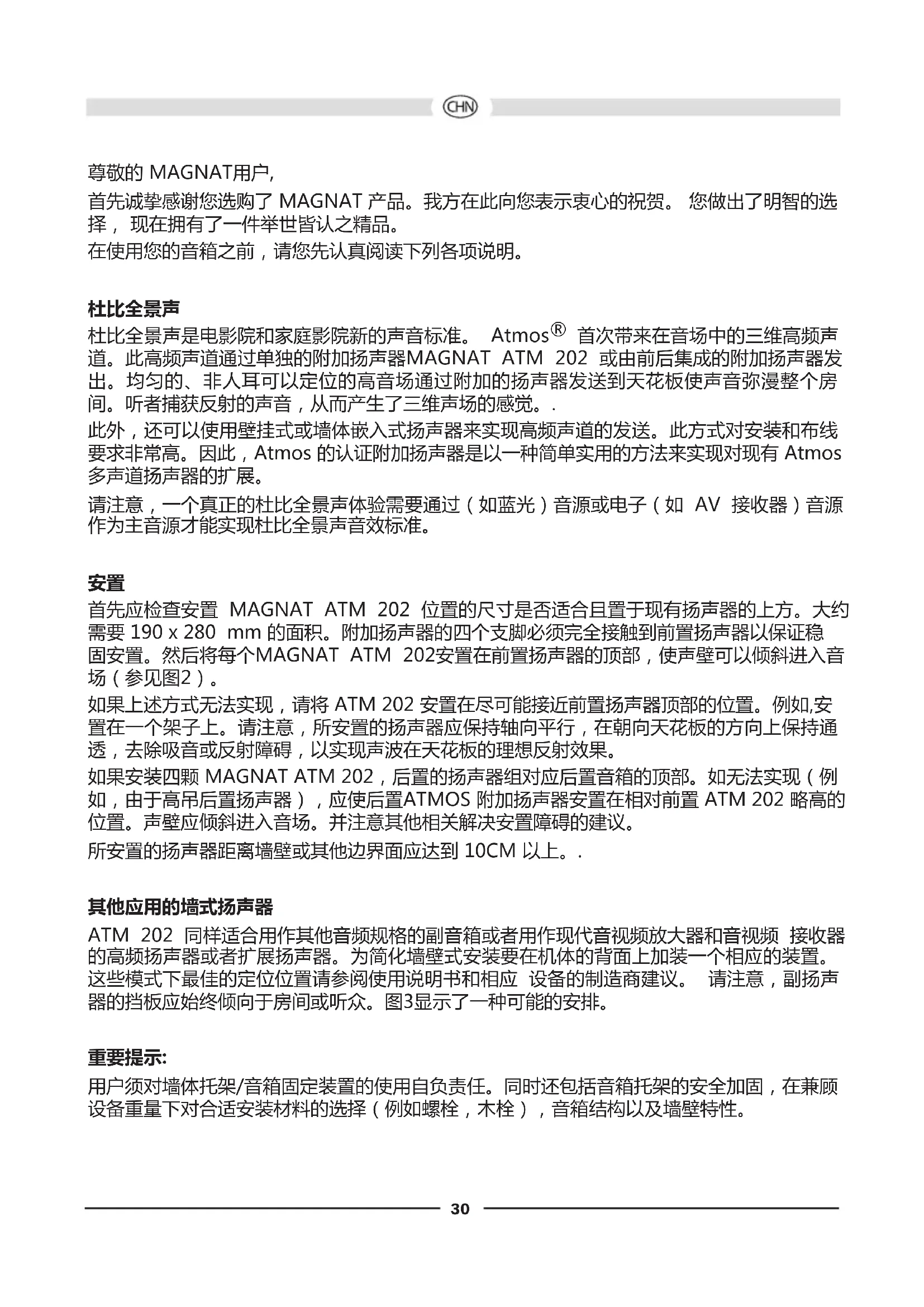 首先应检查安置 MAGNAT ATM 202 位置的尺寸是否适合且置于现有扬声器的上方。大约 需要 190 x 280 mm 的面积。附加扬声器的四个支脚必须完全接触到前置扬声器以保证稳 固安置。然后将每个MAGNAT ATM 202安置在前置扬声器的顶部,使声壁可以倾斜进入音 场(参见图2)。 如果上述方式无法实现,请将 ATM 202 安置在尽可能接近前置扬声器顶部的位置。例如,安 置在一个架子上。请注意,所安置的扬声器应保持轴向平行,在朝向天花板的方向上保持通 透,去除吸音或反射障碍,以实现声波在天花板的理想反射效果。 如果安装四颗 MAGNAT ATM 202,后置的扬声器组对应后置音箱的顶部。如无法实现(例 如,由于高吊后置扬声器),应使后置ATMOS 附加扬声器安置在相对前置 ATM 202 略高的 位置。声壁应倾斜进入音场。并注意其他相关解决安置障碍的建议。 所安置的扬声器距离墙壁或其他边界面应达到 10CM 以上。.