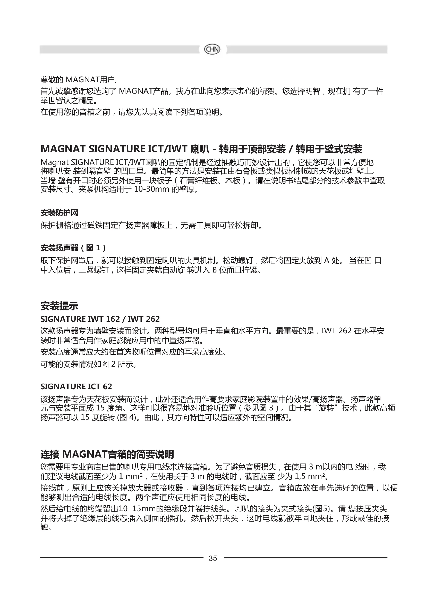 这款扬声器专为墙壁安装而设计。两种型号均可用于垂直和水平方向。最重要的是,IWT 262 在水平安 装时非常适合用作家庭影院应用中的中置扬声器。 安装高度通常应大约在首选收听位置对应的耳朵高度处。 可能的安装情况如图 2 所示。 SIGNATURE ICT 62 该扬声器专为天花板安装而设计,此外还适合用作高要求家庭影院装置中的效果/高扬声器。扬声器单 元与安装平面成 15 度角。这样可以很容易地对准聆听位置(参见图 3)。由于其“旋转”技术,此款高频 扬声器可以 15 度旋转 (图 4)。由此,其方向特性可以适应额外的空间情况。 连接 MAGNAT音箱的简要说明 您需要用专业商店出售的喇叭专用电线来连接音箱。为了避免音质损失,在使用 3 m以内的电 线时,我 们建议电线截面至少为 1 mm²,在使用长于 3 m 的电线时,截面应至 少为 1,5 mm²。 接线前,原则上应该关掉放大器或接收器,直到各项连接均已建立。音箱应放在事先选好的位置,以便 能够测出合适的电线长度。两个声道应使用相同长度的电线。 然后给电线的终端留出10–15mm的绝缘段并卷拧线头。喇叭的接头为夹式接头(图5)。请 您按压夹头 并将去掉了绝缘层的线芯插入侧面的插孔。然后松开夹头,这时电线就被牢固地夹住,形成最佳的接 触。36 在连接电线时,请您务必注意要接对正负极,即喇叭的黑色(-)端子与放大器的(-) 端子相接,而喇叭的红 色(+)端子与放大器相应的(+)端子相接。为了方便正负极的连接,市场上常见的喇叭用线的一股线芯是 带有纹路的或着了色,作为区别标记。 再仔细检查一遍电线的连接是否无松动,线芯是否翘出毛头,防止引起短路。短路会严重损坏连接着的