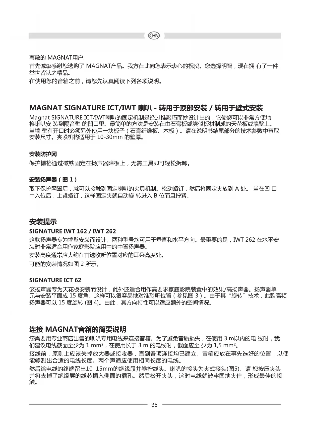 这款扬声器专为墙壁安装而设计。两种型号均可用于垂直和水平方向。最重要的是,IWT 262 在水平安 装时非常适合用作家庭影院应用中的中置扬声器。 安装高度通常应大约在首选收听位置对应的耳朵高度处。 可能的安装情况如图 2 所示。 SIGNATURE ICT 62 该扬声器专为天花板安装而设计,此外还适合用作高要求家庭影院装置中的效果/高扬声器。扬声器单 元与安装平面成 15 度角。这样可以很容易地对准聆听位置(参见图 3)。由于其“旋转”技术,此款高频 扬声器可以 15 度旋转 (图 4)。由此,其方向特性可以适应额外的空间情况。 连接 MAGNAT音箱的简要说明 您需要用专业商店出售的喇叭专用电线来连接音箱。为了避免音质损失,在使用 3 m以内的电 线时,我 们建议电线截面至少为 1 mm²,在使用长于 3 m 的电线时,截面应至 少为 1,5 mm²。 接线前,原则上应该关掉放大器或接收器,直到各项连接均已建立。音箱应放在事先选好的位置,以便 能够测出合适的电线长度。两个声道应使用相同长度的电线。 然后给电线的终端留出10–15mm的绝缘段并卷拧线头。喇叭的接头为夹式接头(图5)。请 您按压夹头 并将去掉了绝缘层的线芯插入侧面的插孔。然后松开夹头,这时电线就被牢固地夹住,形成最佳的接 触。36 在连接电线时,请您务必注意要接对正负极,即喇叭的黑色(-)端子与放大器的(-) 端子相接,而喇叭的红 色(+)端子与放大器相应的(+)端子相接。为了方便正负极的连接,市场上常见的喇叭用线的一股线芯是 带有纹路的或着了色,作为区别标记。 再仔细检查一遍电线的连接是否无松动,线芯是否翘出毛头,防止引起短路。短路会严重损坏连接着的