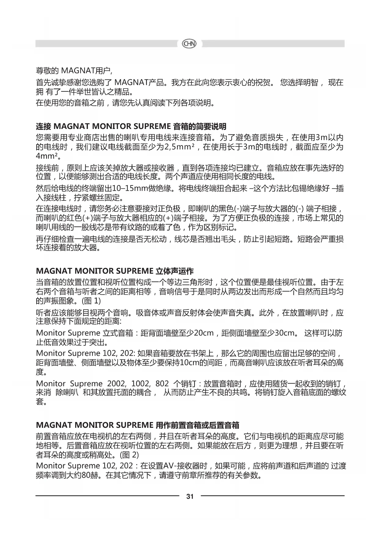 前置音箱应放在电视机的左右两侧,并且在听者耳朵的高度。它们与电视机的距离应尽可能 地相等。后置音箱应放在视听位置的左右两侧。如果能放在后方,则更为理想,并且要在听 者耳朵的高度或稍高处。(图 2) Monitor Supreme 102, 202:在设置AV-接收器时,如果可能,应将前声道和后声道的 过渡 频率调到大约80赫。在其它情况下,请遵守前章所推荐的有关参数。32
