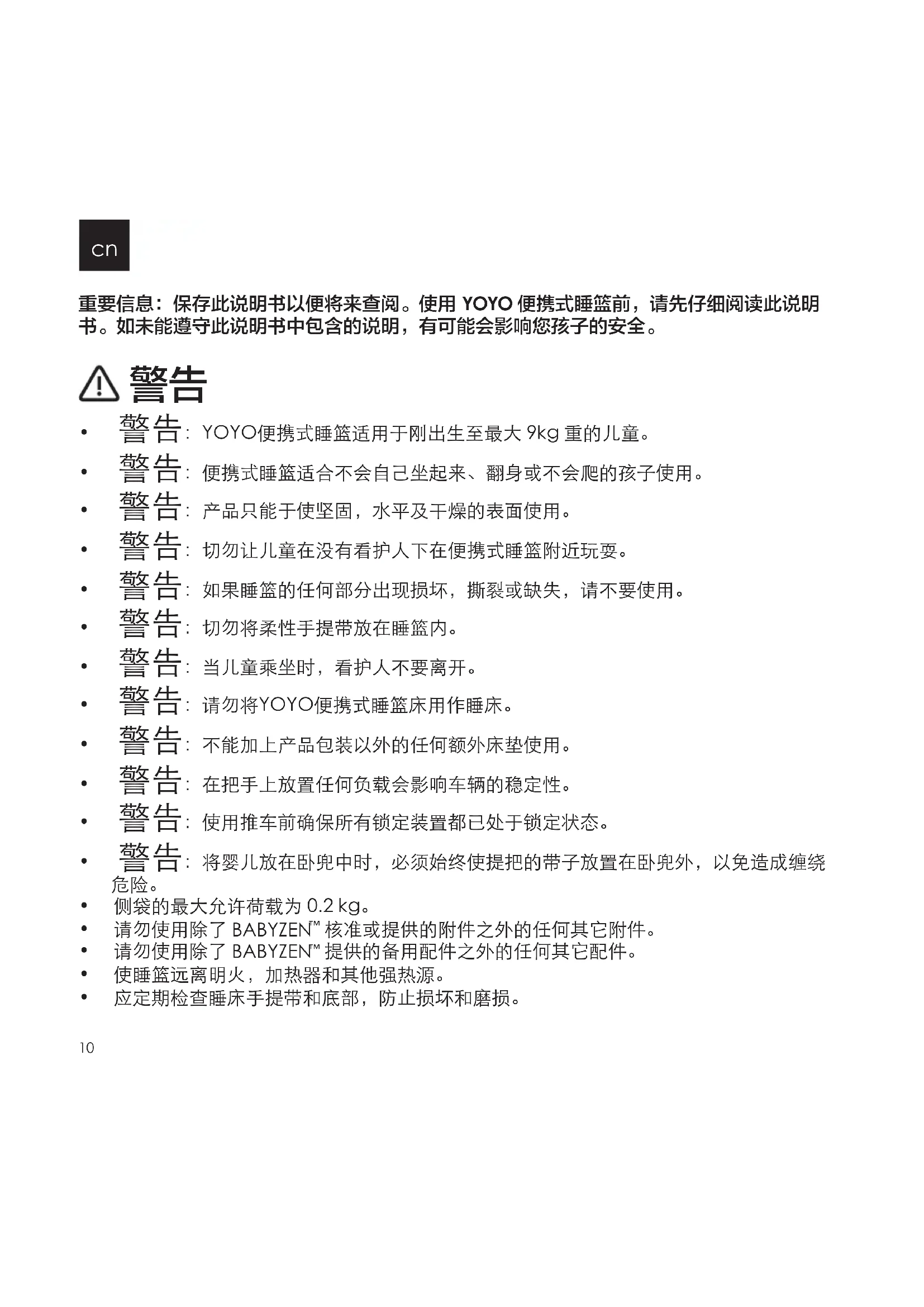 - 警告:YOYO便携式睡篮适用于刚出生至最大9kg重的儿童。
