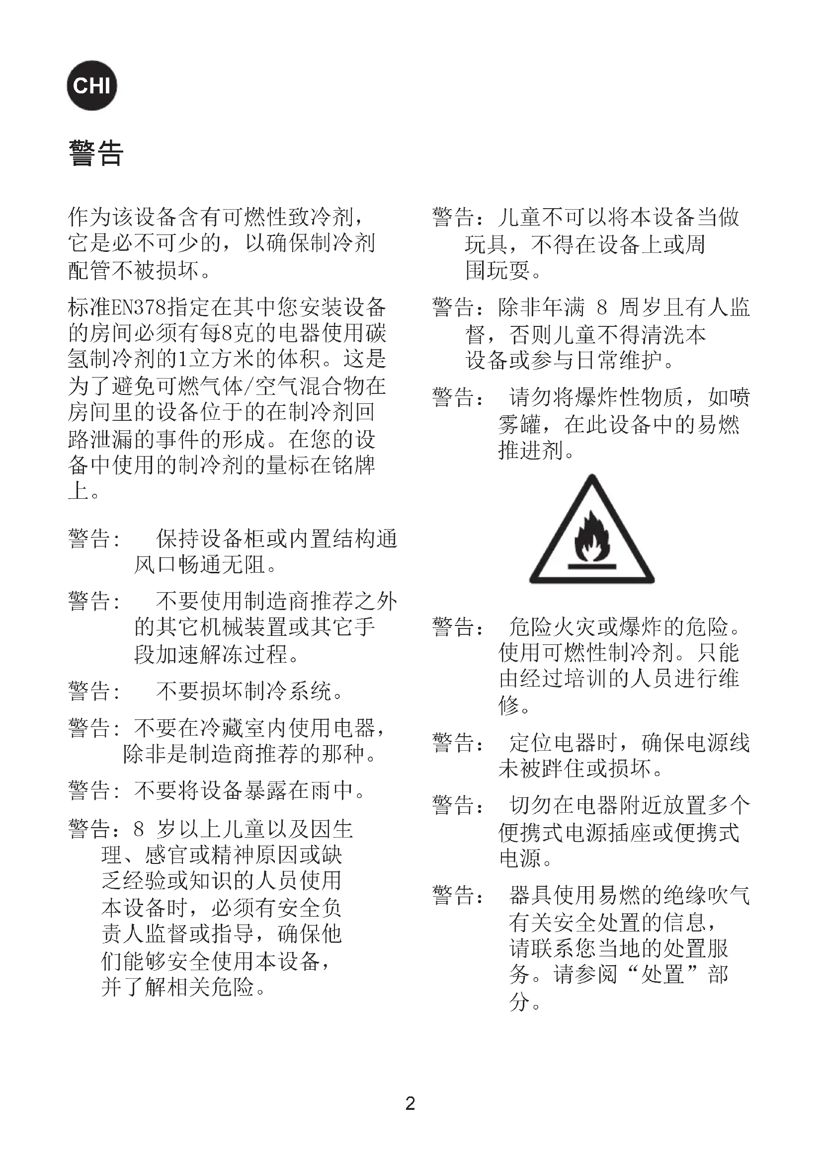 警告:不要损坏制冷系统。 警告:不要在冷藏室内使用电器, 除非是制造商推荐的那种。 警告:不要将设备暴露在雨中。 警告:8岁以上儿童以及因生 理、感官或精神原因或缺 乏经验或知识的人员使用 本设备时,必须有安全负 责人监督或指导,确保他 们能够安全使用本设备,