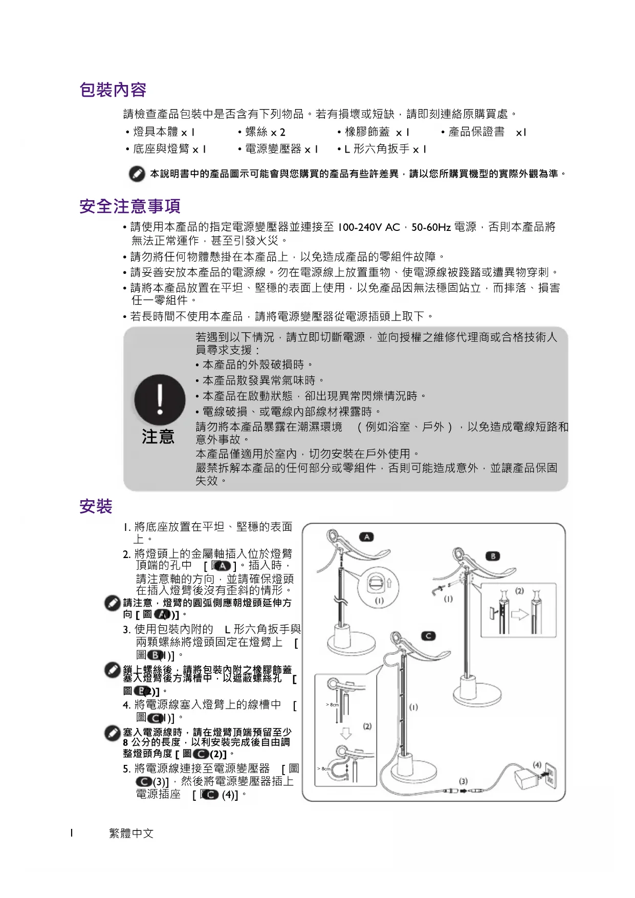 - 請使用本產品的指定電源變壓器並連接至 100-240V AC,50-60Hz 電源,否則本產品將 無法正常運作,甚至引發火災。
