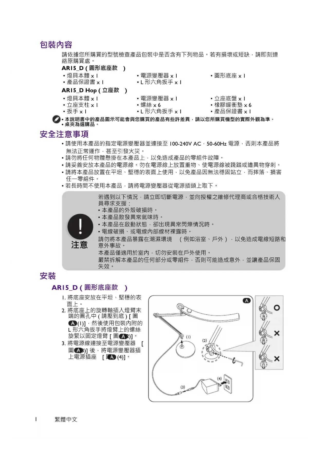 - 燈具本體 x 1 • 電源變壓器 x 1 • 立座底盤 x 1