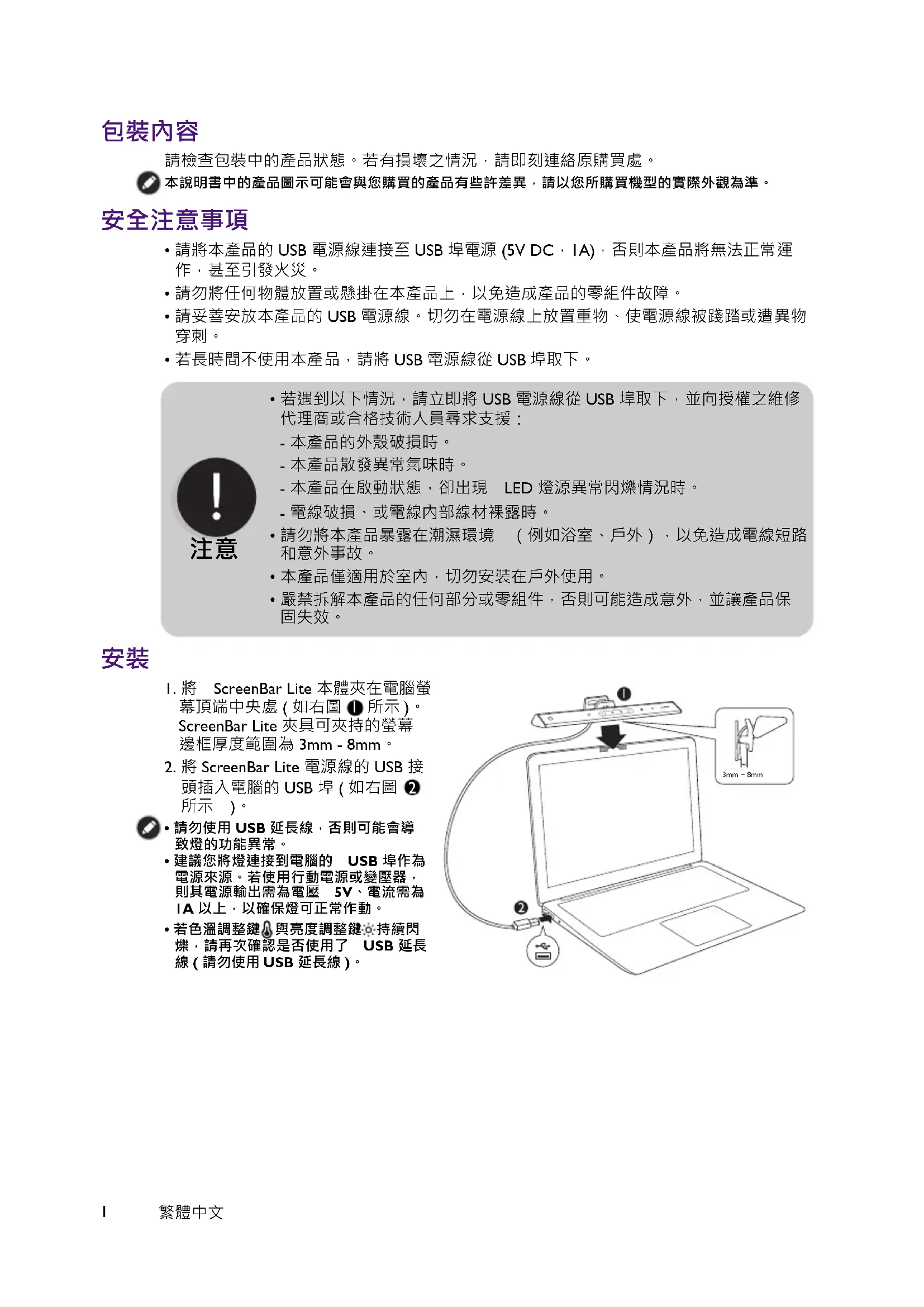 - 若遇到以下情況,請立即將 USB 電源線從 USB 埠取下,並向授權之維修 代理商或合格技術人員尋求支援: - 本產品的外殼破損時。 - 本產品散發異常氣味時。 - 本產品在啟動狀態,卻出現 LED 燈源異常閃爍情況時。 - 電線破損、或電線內部線材裸露時。