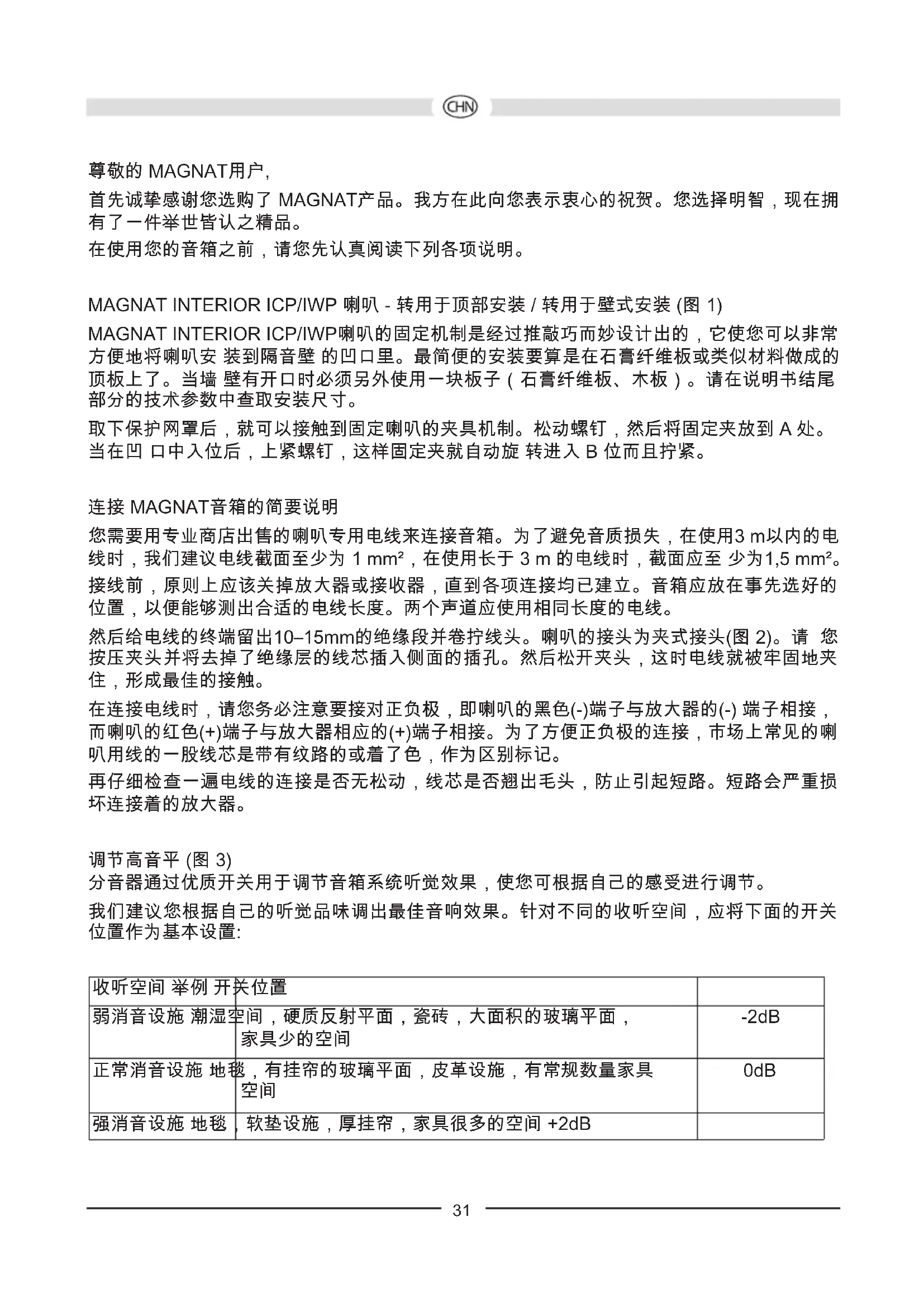 方便地将喇叭安 装到隔音壁 的凹口里。最简便的安装要算是在石膏纤维板或类似材料做成的 顶板上了。当墙 壁有开口时必须另外使用一块板子(石膏纤维板、木板)。请在说明书结尾 部分的技术参数中查取安装尺寸。 取下保护网罩后,就可以接触到固定喇叭的夹具机制。松动螺钉,然后将固定夹放到 A 处。 当在凹 口中入位后,上紧螺钉,这样固定夹就自动旋 转进入 B 位而且拧紧。 连接 MAGNAT音箱的简要说明 您需要用专业商店出售的喇叭专用电线来连接音箱。为了避免音质损失,在使用3 m以内的电 线时,我们建议电线截面至少为 1 mm²,在使用长于 3 m 的电线时,截面应至 少为1,5 mm²。 接线前,原则上应该关掉放大器或接收器,直到各项连接均已建立。音箱应放在事先选好的 位置,以便能够测出合适的电线长度。两个声道应使用相同长度的电线。 然后给电线的终端留出10–15mm的绝缘段并卷拧线头。喇叭的接头为夹式接头(图 2)。请 您 按压夹头并将去掉了绝缘层的线芯插入侧面的插孔。然后松开夹头,这时电线就被牢固地夹
