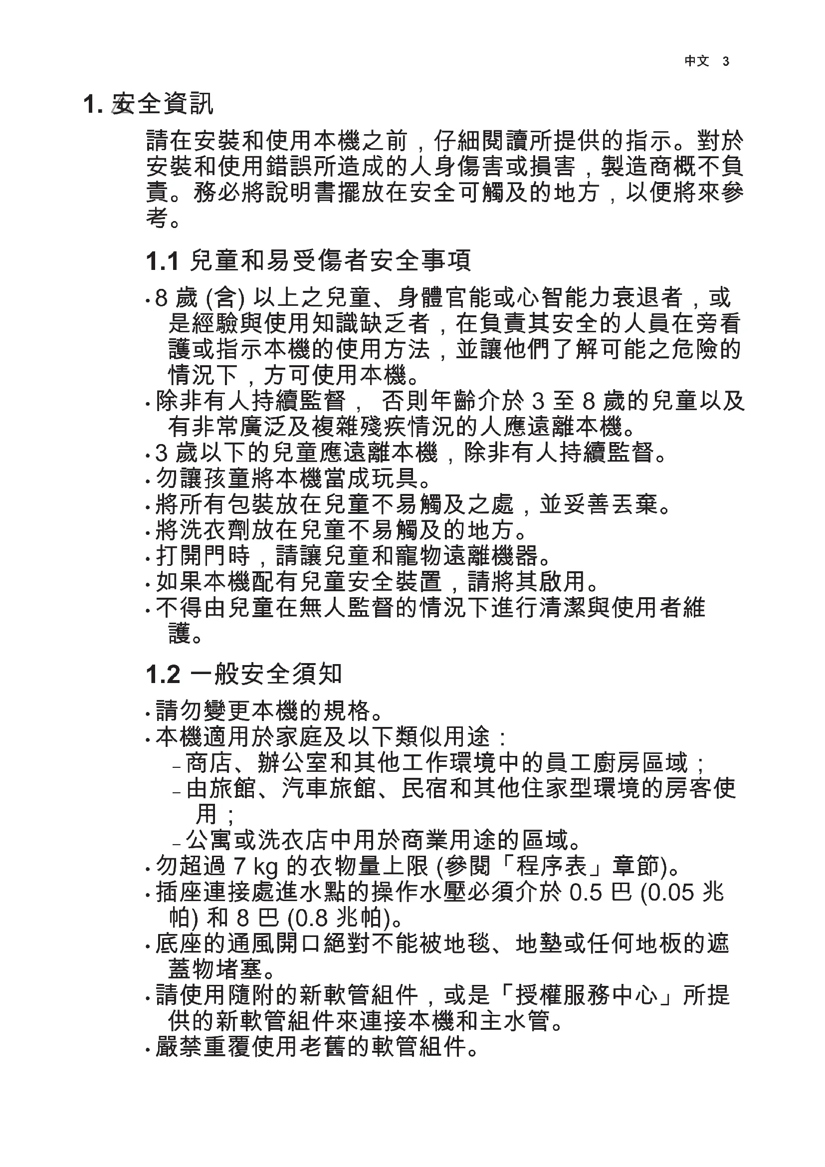- 嚴禁重覆使用老舊的軟管組件。 中文 3• 如果主電源線已損壞,則必須由製造商、其維修代理商 或類似的合格人員更換,以避免發生觸電危險。