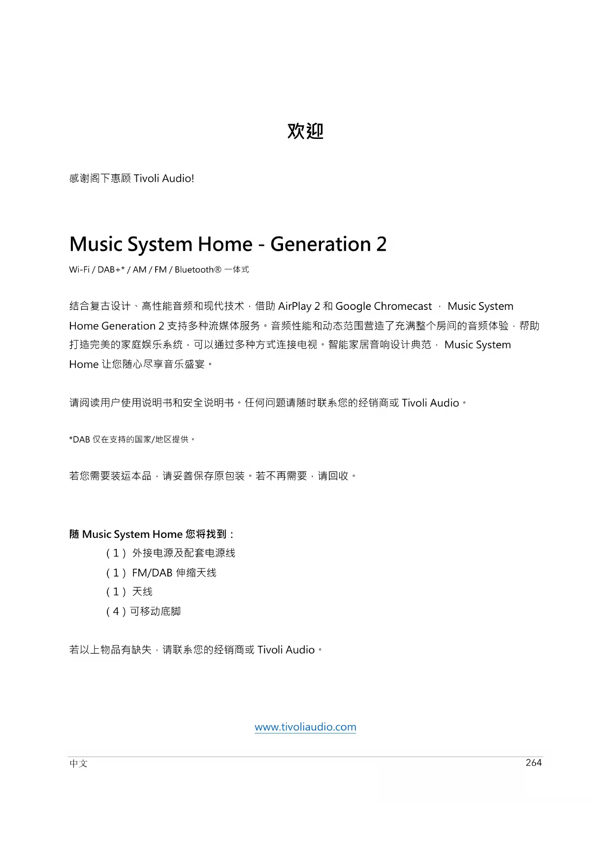 随 Music System Home 您将找到: (1) 外接电源及配套电源线 (1) FM/DAB 伸缩天线 (1) 天线 (4)可移动底脚 若以上物品有缺失,请联系您的经销商或 Tivoli Audio。