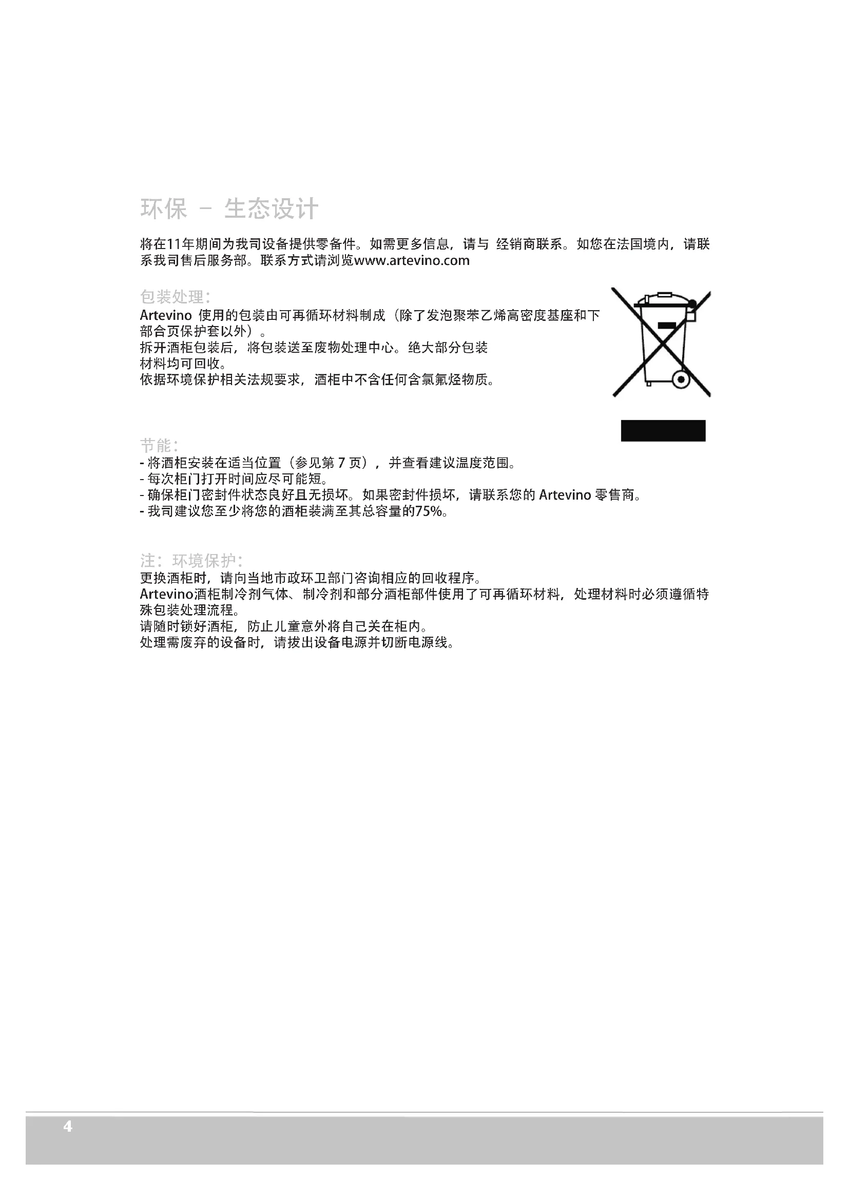 更换酒柜时,请向当地市政环卫部门咨询相应的回收程序。 Artevino酒柜制冷剂气体、制冷剂和部分酒柜部件使用了可再循环材料,处理材料时必须遵循特
