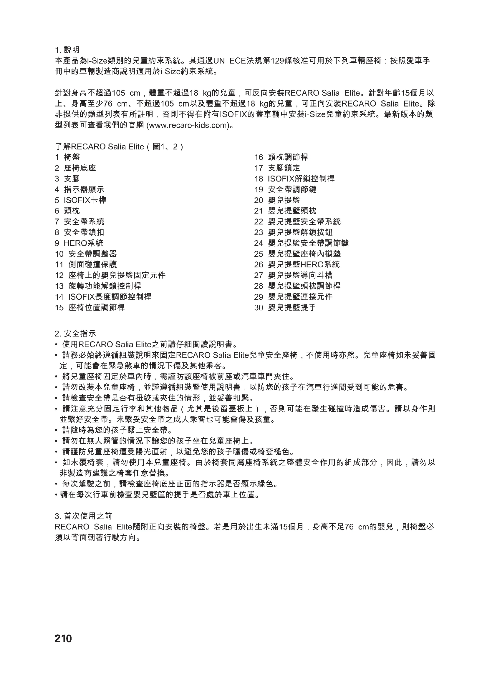 本產品為i-Size類別的兒童約束系統。其通過UN ECE法規第129條核准可用於下列車輛座椅:按照愛車手 冊中的車輛製造商說明適用於i-Size約束系統。 針對身高不超過105 cm,體重不超過18 kg的兒童,可反向安裝RECARO Salia Elite。針對年齡15個月以 上、身高至少76 cm、不超過105 cm以及體重不超過18 kg的兒童,可正向安裝RECARO Salia Elite。除 非提供的類型列表有所註明,否則不得在附有ISOFIX的舊車輛中安裝i-Size兒童約束系統。最新版本的類 型列表可查看我們的官網 (www.recaro-kids.com)。 了解RECARO Salia Elite(圖1、2) 1 椅盤 2 座椅底座 3 支腳 4 指示器顯示 5 ISOFIX卡榫 6 頭枕 7 安全帶系統 8 安全帶鎖扣 9 HERO系統 10 安全帶調整器 11 側面碰撞保護 12 座椅上的嬰兒提籃固定元件 13 旋轉功能解鎖控制桿 14 ISOFIX長度調節控制桿 15 座椅位置調節桿 16 頭枕調節桿 17 支腳鎖定 18 ISOFIX解鎖控制桿 19 安全帶調節鍵 20 嬰兒提籃 21 嬰兒提籃頭枕 22 嬰兒提籃安全帶系統 23 嬰兒提籃解鎖按鈕 24 嬰兒提籃安全帶調節鍵 25 嬰兒提籃座椅內襯墊 26 嬰兒提籃HERO系統 27 嬰兒提籃導向斗槽 28 嬰兒提籃頭枕調節桿 29 嬰兒提籃連接元件 30 嬰兒提籃提手