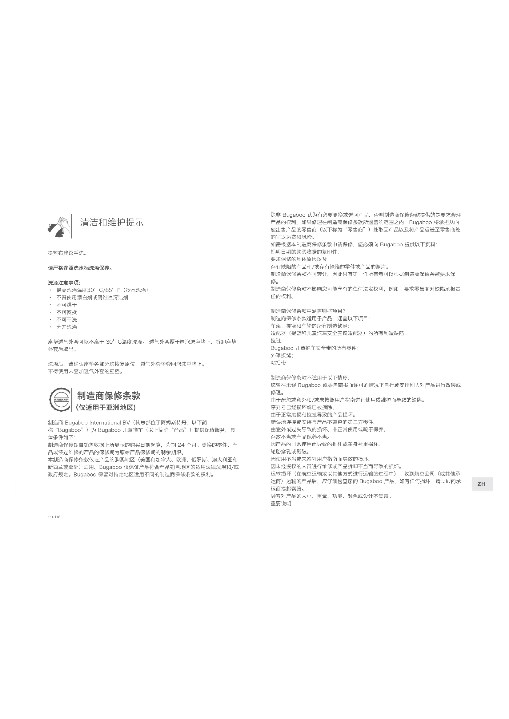 制造商保修期自销售收据上所显示的购买日期起算,为期 24 个月。更换的零件、产 品或经过维修的产品的保修期为原始产品保修期的剩余期限。 本制造商保修条款仅在产品的购买地区(美国和加拿大、欧洲、俄罗斯、澳大利亚和 新西兰或亚洲)适用。Bugaboo 仅保证产品符合产品销售地区的适用法律法规和/或 政府规定。Bugaboo 保留对特定地区适用不同的制造商保修条款的权利。