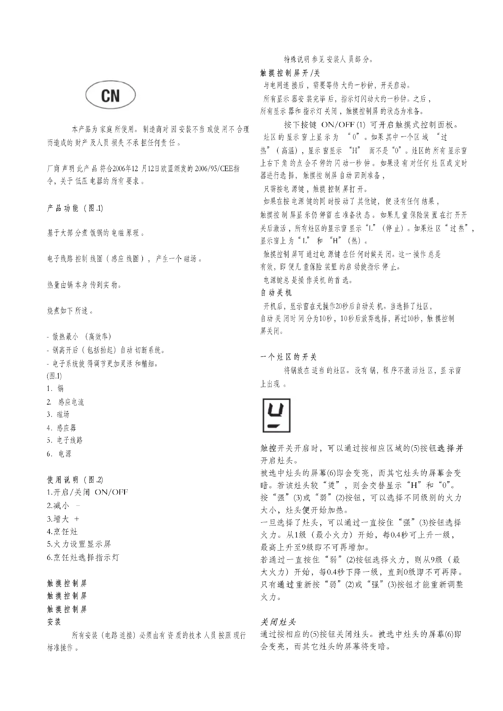 3.磁场 4.感应器 5.电子线路 6. 电源 使 用 说 明 (图 .2) 1.开启/关闭 ON/OFF 2.减小 – 3.增大 + 4.烹饪灶 5.火力设置显示屏 6.烹饪灶选择指示灯