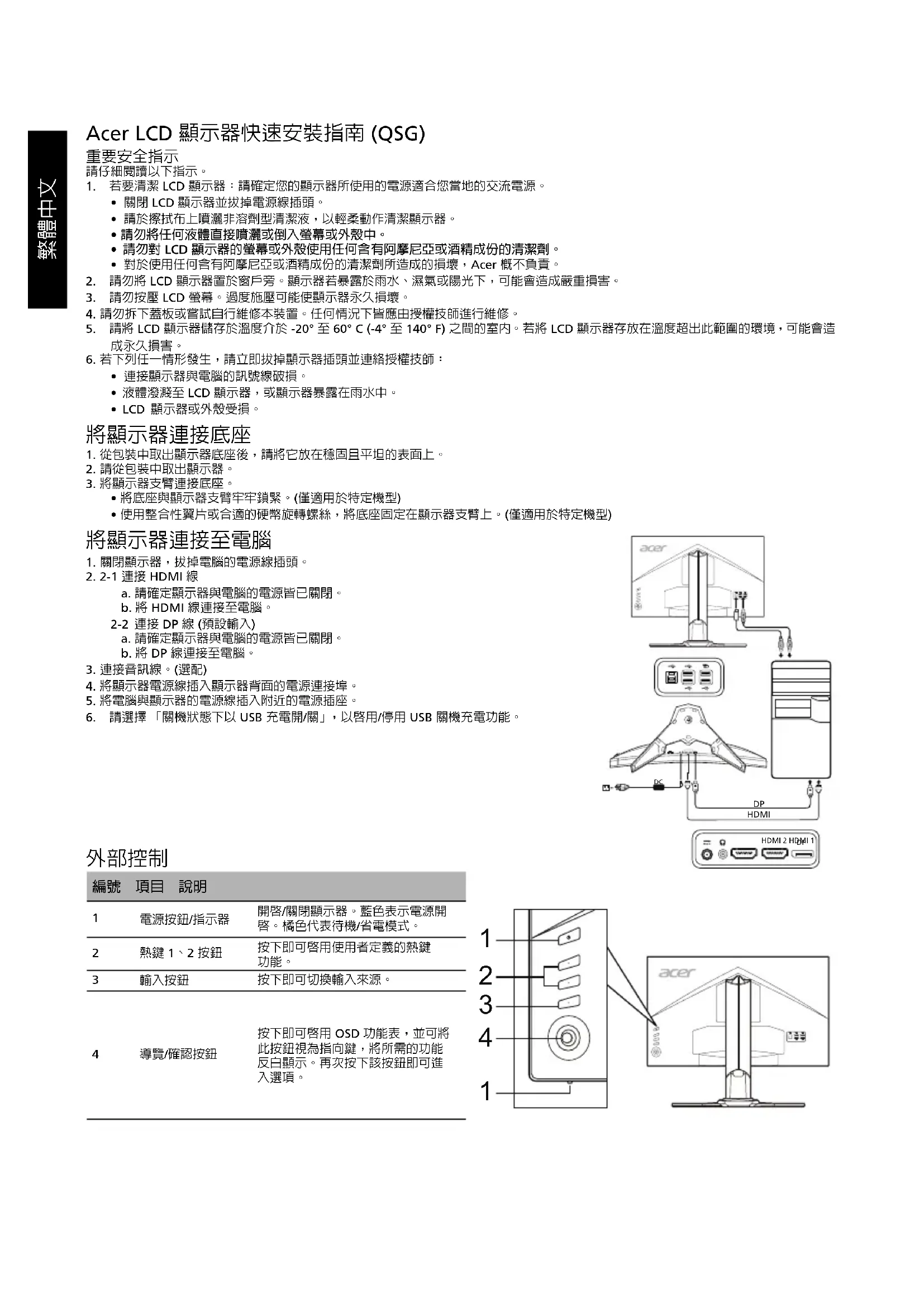 電源按鈕/指示器開啟/關閉顯示器。藍色表示電源開啟。橘色代表待機/省電模式。 熱鍵 1、2 按鈕按下即可啟用使用者定義的熱鍵