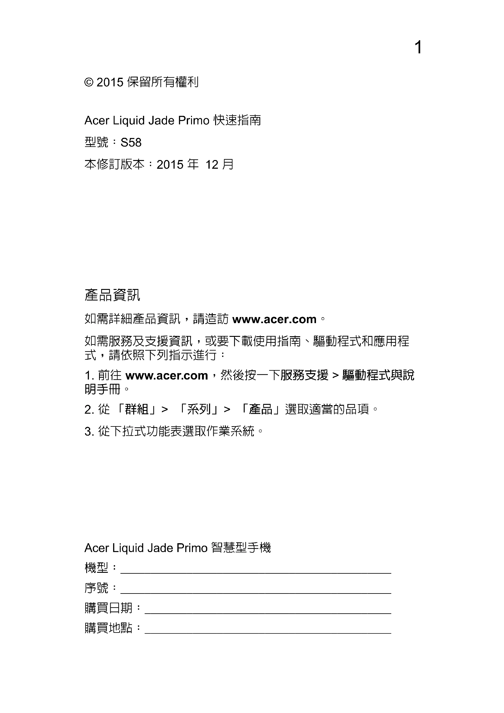 © 2015 保留所有權利 Acer Liquid Jade Primo 快速指南 型號:S58 本修訂版本:2015 年 12 月 Acer Liquid Jade Primo 智慧型手機 機型:_____________________________________________ 序號:_____________________________________________ 購買日期:_________________________________________ 購買地點:_________________________________________2