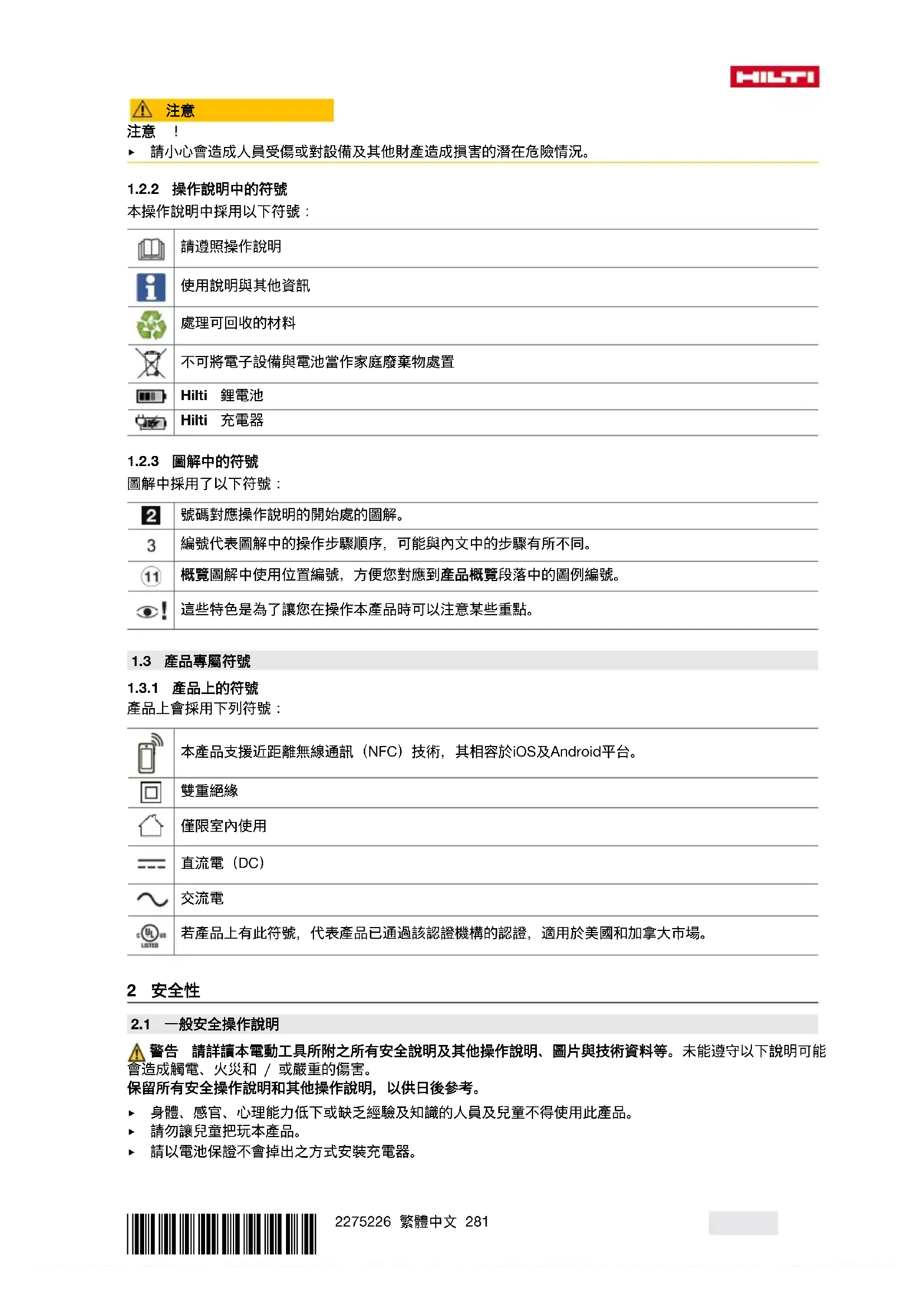 ▶ 電池應避免淋雨、潮濕和水氣。水氣滲入會造成短路、觸電、燙傷、起火和爆炸。 ▶ 請使用適用於該電池型號的充電器與電動工具。請詳閱並遵守相關操作說明書中的說明。 ▶ 請勿在易爆炸環境中使用或存放電池。 ▶ 若電池溫度過高無法觸摸,表示電池可能已經毀損。將電池放在清楚可見且沒有火災危險、遠離易燃材料 的位置。讓電池冷卻。若一小時後電池溫度仍然過高無法觸摸,表示電池可能已經毀損。請洽詢Hilti維修 中心或詳讀「Hilti鋰電池安全注意事項和使用」文件。 請遵守適用於運輸、存放和使用鋰離子電池的專用指令。 請透過本操作說明書末尾的條碼取得並詳讀Hilti鋰電池安全注意事項和使用。*2275226* 2275226 繁體中文 283 3 說明