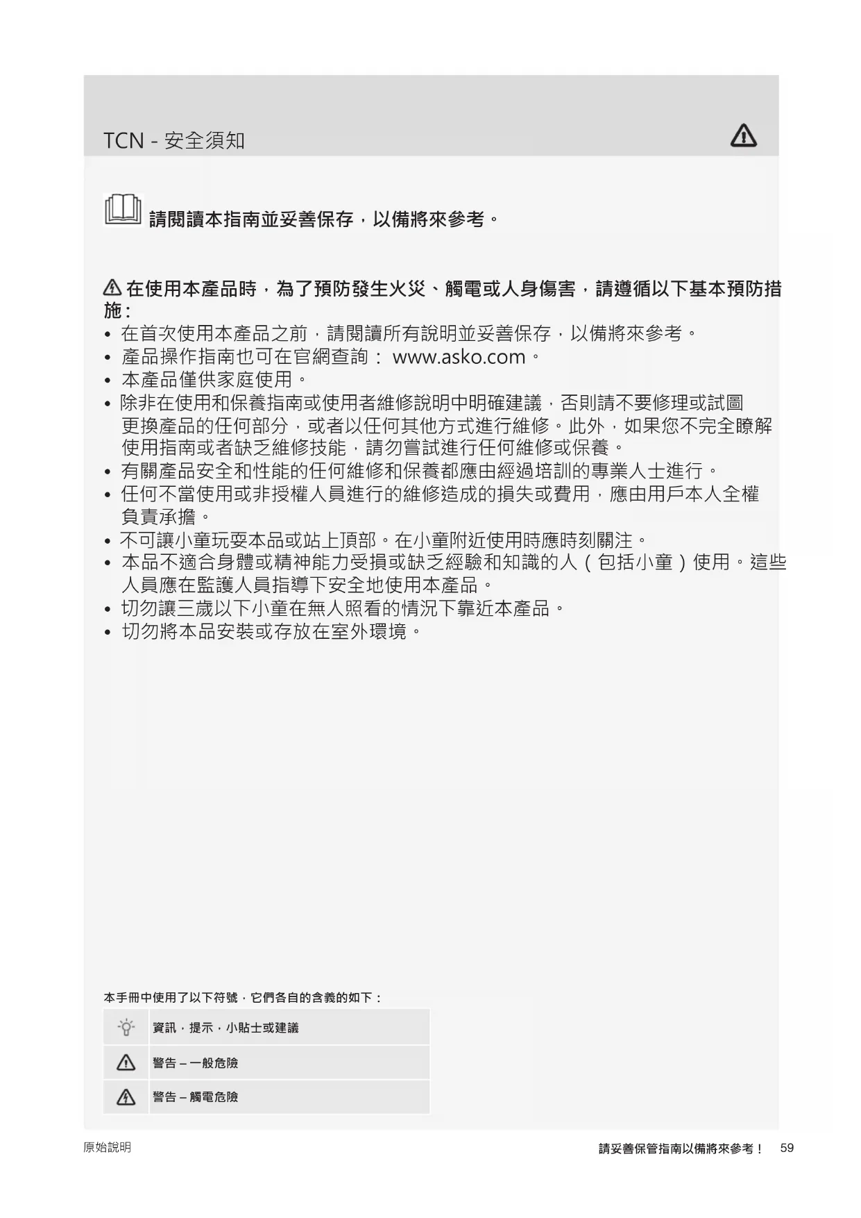 - 產品操作指南也可在官網查詢: www.asko.com。