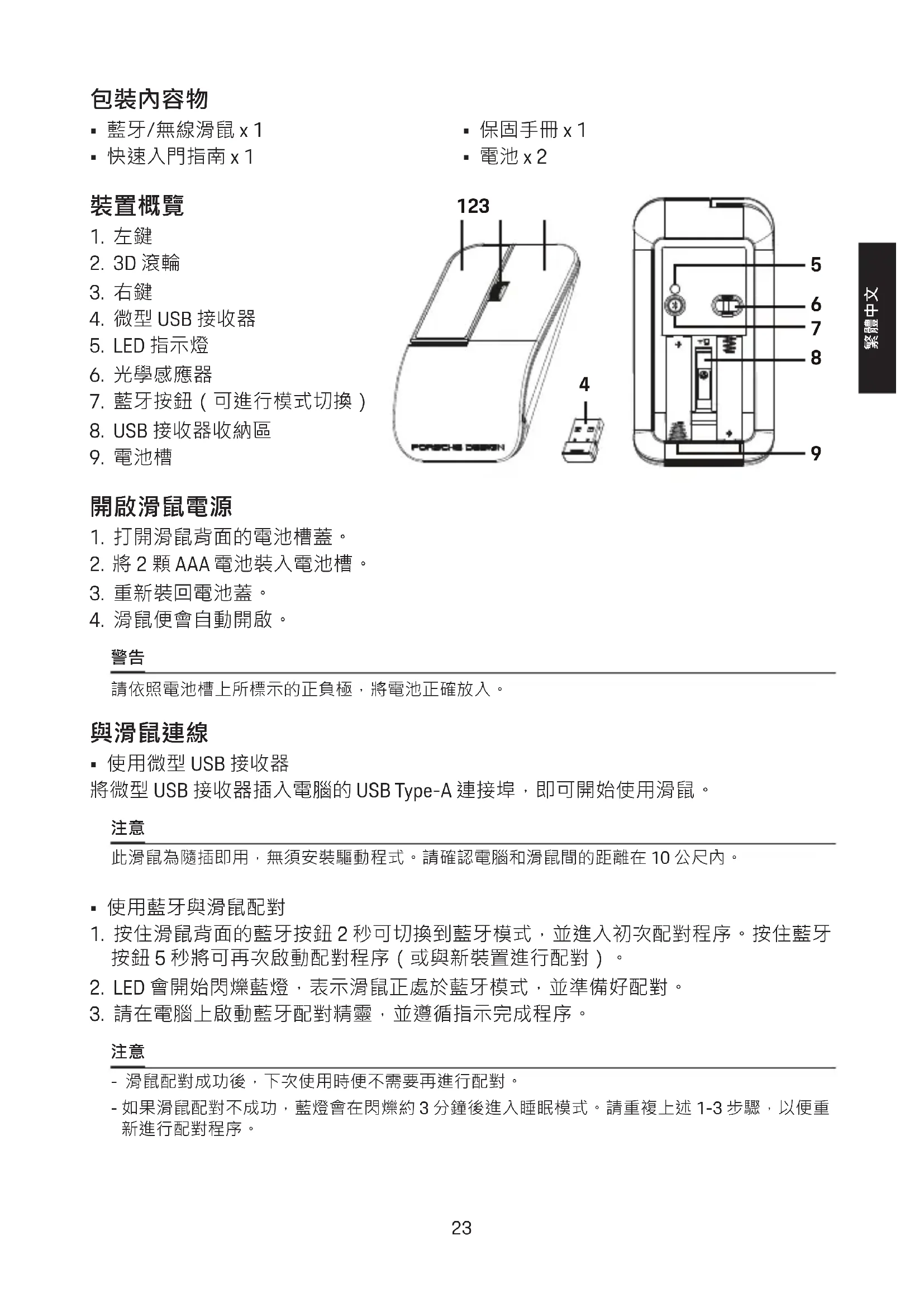 當電池電量不足,在使用滑鼠時會持續閃爍紅燈。不使用滑鼠時,LED 在閃爍紅燈 10秒後便會停止。