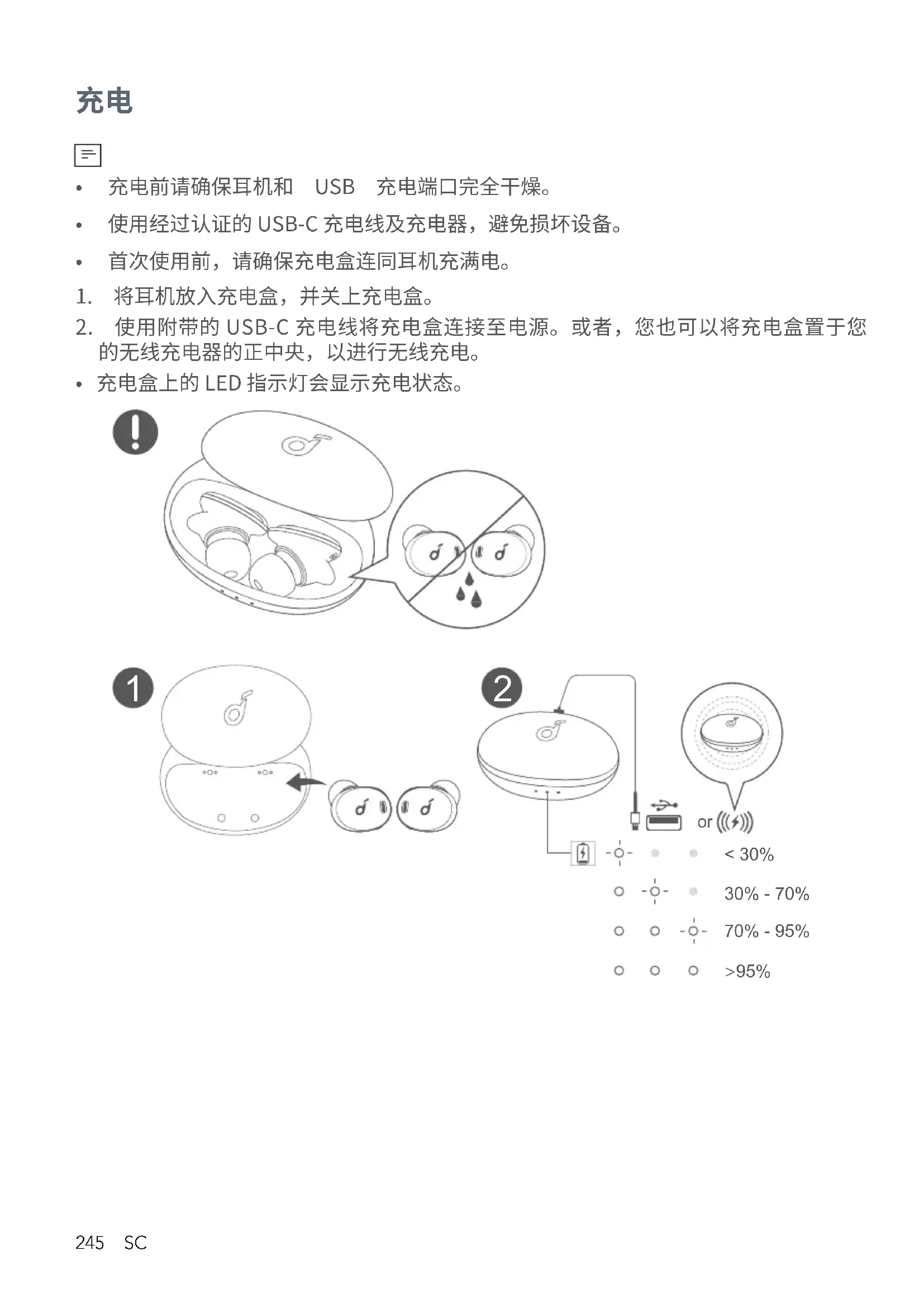 - 充电盒上的LED指示灯会显示充电状态。 < 30% 30% - 70% 70% - 95% >95%