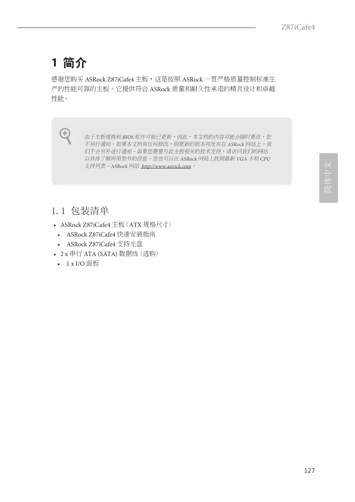 1 简介 感谢您购买 ASRock Z87iCafe4 主板,这是按照 ASRock 一贯严格质量控制标准生 产的性能可靠的主板。它提供符合 ASRock 质量和耐久性承诺的精良设计和卓越