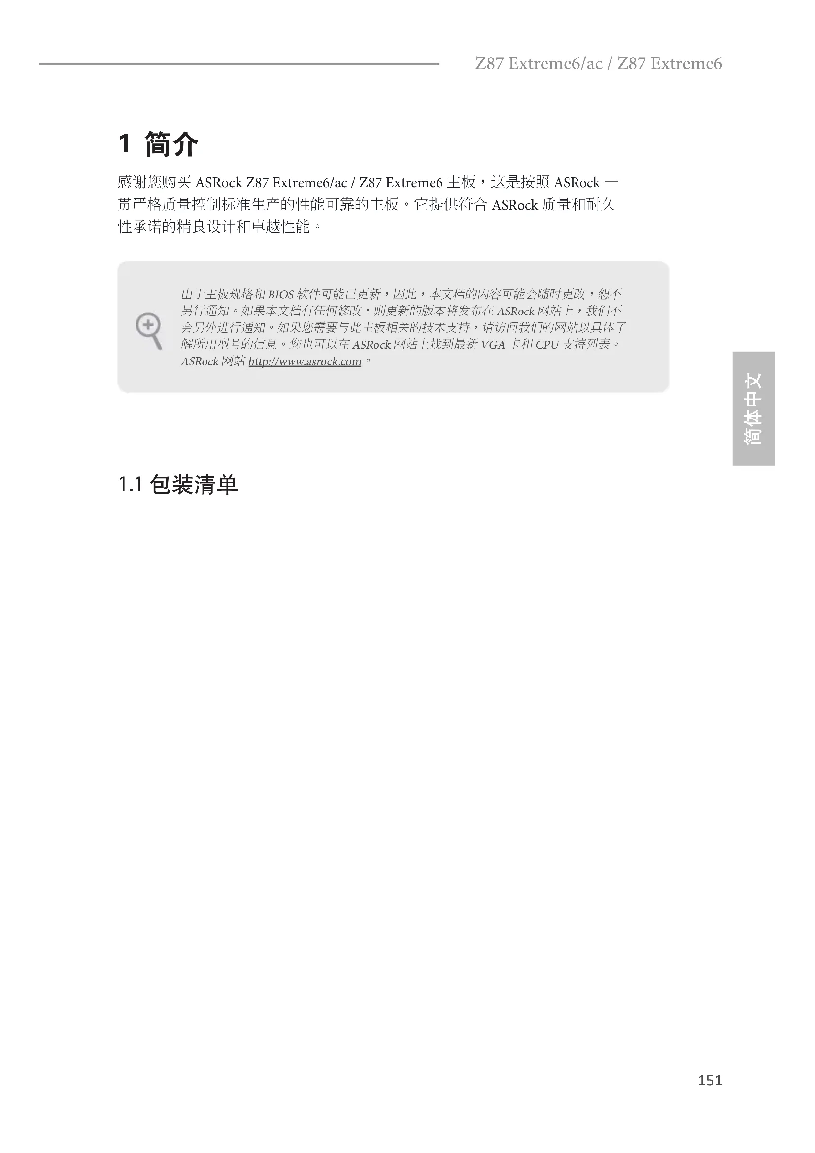 Z87 Extreme6/ac / Z87 Extreme6 1 简介 感谢您购买 ASRock Z87 Extreme6/ac / Z87 Extreme6 主板,这是按照 ASRock 一 贯严格质量控制标准生产的性能可靠的主板。它提供符合 ASRock 质量和耐久 性承诺的精良设计和卓越性能。