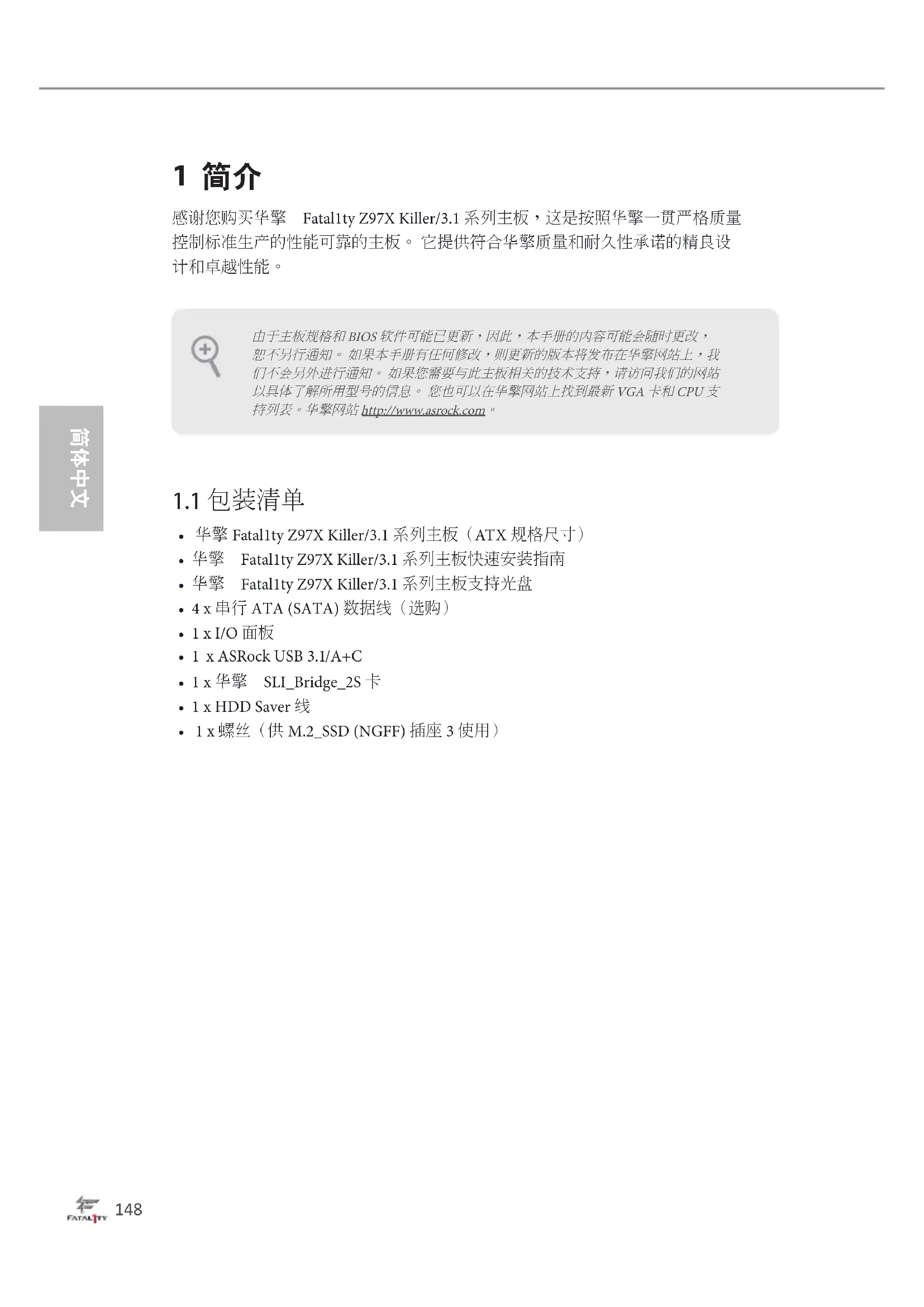 Fatal1ty Z97X Killer/3.1 Series 1 简介 感谢您购买华擎 Fatal1ty Z97X Killer/3.1 系列主板,这是按照华擎一贯严格质量 控制标准生产的性能可靠的主板。 它提供符合华擎质量和耐久性承诺的精良设
