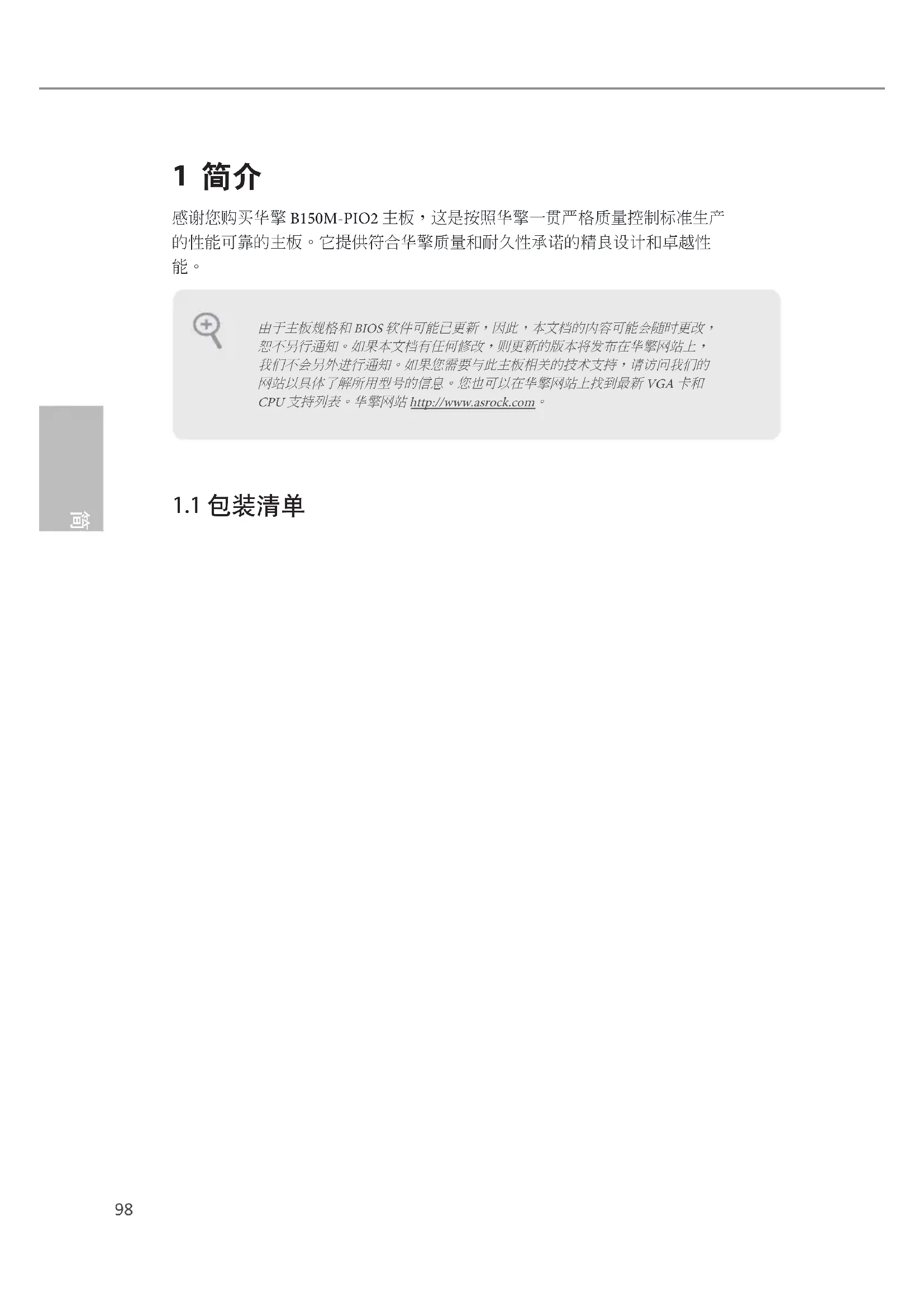 1 简介 感谢您购买华擎 B150M-PIO2 主板,这是按照华擎一贯严格质量控制标准生产 的性能可靠的主板。它提供符合华擎质量和耐久性承诺的精良设计和卓越性