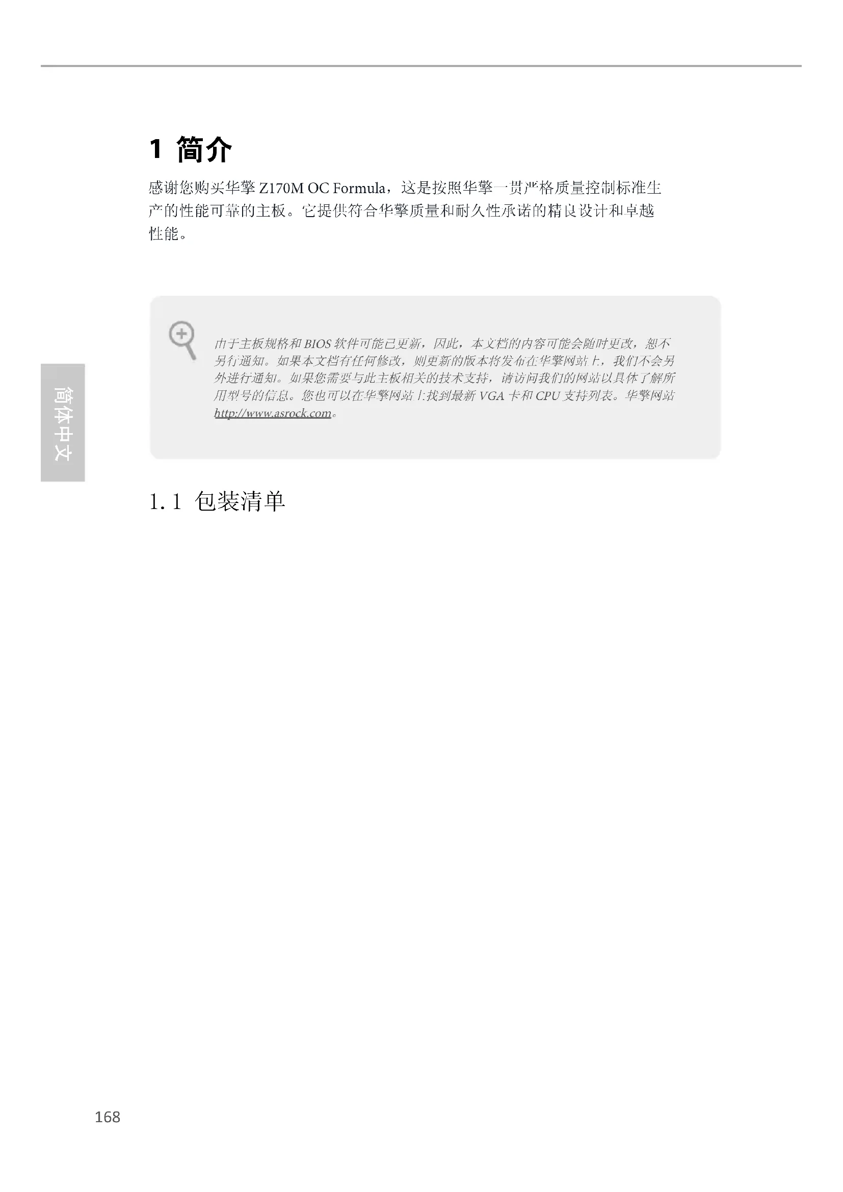 - 1 x 螺丝(供 M.2 插座使用) 由于主板规格和 BIOS 软件可能已更新,因此,本文档的内容可能会随时更改,恕不另行通知。如果本文档有任何修改,则更新的版本将发布在华擎网站上,我们不会另外进行通知。如果您需要与此主板相关的技术支持,请访问我们的网站以具体了解所用型号的信息。您也可以在华擎网站上找到最新 VGA 卡和 CPU 支持列表。华擎网站 http://www.asrock.com。169 Z170M OC Formula