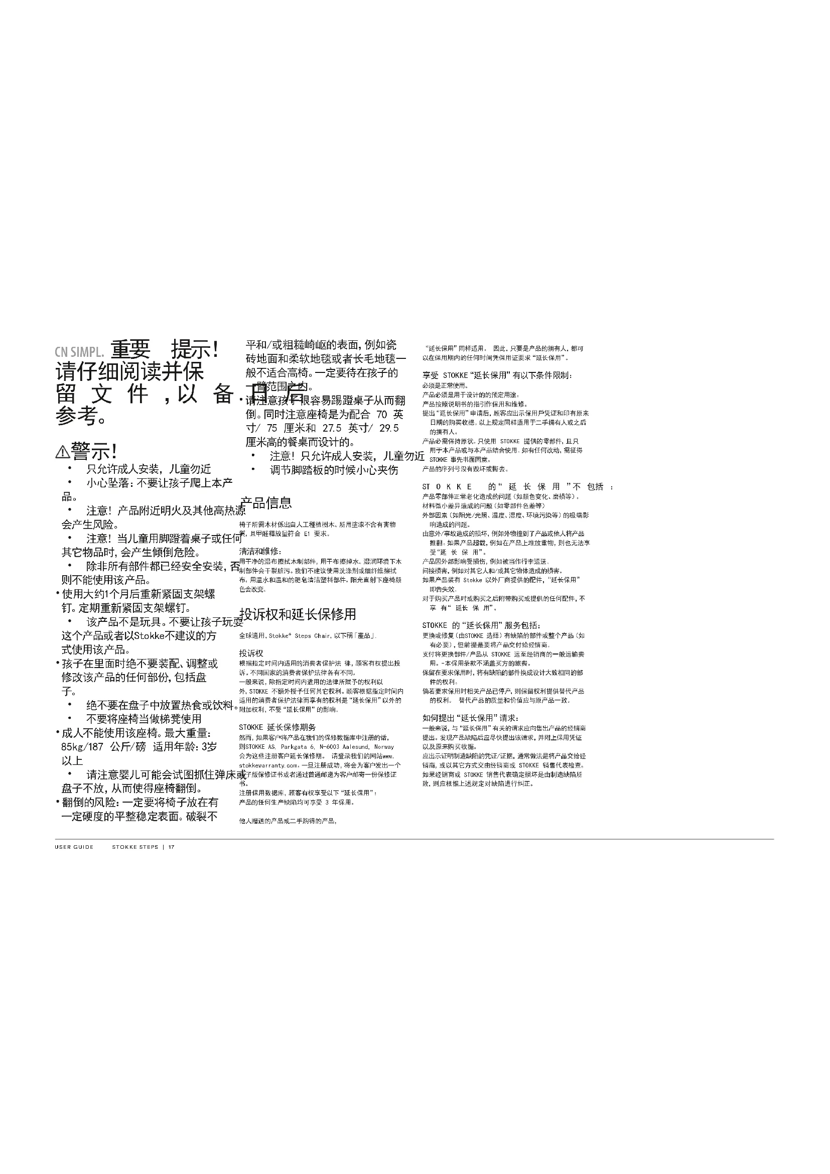 顧客有權根據指定時間適用之消費者保護律進行投訴,類似的法律可能因國家不同而有所區別。 儘管提及下文描述之「延長保用」,一般而言,除在指定時間 由適用法律規定之權利外,STOKKEAS不向顧客授予超出該範圍之任何附加權利。在指定時間適用之消費者保護法規定之顧客權 利,是「延長保用」權利以外之附加權利,因此不受影響。 STOKKE延長保修期然而,如果客戶將產品在我們的保修資料庫中註冊的話,則STOKKEAS,Parkgata6,N-6003Aalesund,Norway會為這些註冊客戶延長保修期。請登錄我們的網站www.stokkewarranty.com。一旦註冊成功,將會為客戶發出一個電子版保修證書或者通過普通郵遞為客戶郵寄一份保修證 在保用資料庫中註冊後,擁有人享有以下「延長保用」服務:「產 品 」中 任 何 製 造 瑕 疵 之 三 年 保 用 「延長保用」同時適用於作為禮品轉贈之「產品」或購得之二 手「產 品」。因此,在指定 時間 該「產品」之擁有人,均可 在保 用期內憑出示保用卡享受「延長保用」服務。S T O K K E「 延 長 保 用」之 條 件 如 下:正常使用。「產品」於指定用途下使用。 「產品」依照保養/說明手冊所述之保養程序正常保養。 行使「延長保用」時,須出示保用卡,並同時出示加蓋日期章 戳的原來購買發票。該項同樣適用於任何二手擁有人及後續擁有人。須保持其原有狀態,依此只使用STOKKE所提供之零件,且零件須按指定用途使用於產品或與產品合併使用。任何與此偏離之情況均須取得STOKKE事前以書面同意。產品的序列号没有毁壞或撕去。S T O K K E 的“ 延 长 保 用 ”不 包 括 : 組成「產品」之零件正常老化所致之問題(如:顏色變化及磨 材料中微小差異所致之問題(如:零件間的顏色差異)。 陽 光 / 光 線 、溫 度 、濕 度 、環 境 污 染 等 外 部 因 素 之 極 端 影 響 所致之問題。因意外/事故而對產品造成的損壞,例如任何其它物件撞擊產品或他人將產品推翻。如果產品超載,例如在產品上堆放重物,也不可享受延長保用。 外部影響對「產品」所造成之損害,如:將「產品」作為行李 寄送而造成的。間接損害,如:對任何人及/或任何其它物件所造成之損害。 如果「產品」加裝非由Stokke所提供之任何配件,則「延長 「延長保用」不適用於隨「產品」共同購買或提供,或稍後購 買之任何配件。STOKKE的“延长保用”服务包括: 更換或修理瑕疵零件(由STOKKE選擇)或整個「產品」(必 要 時 ),惟 須 將 「 產 品 」 運 送 至 經 銷 商 處 。承 擔 任 何 更 換 零 件 /「產 品 」由 S T O K K E 至 購 買「產 品 」之 經銷商處的正常運輸費用。根據保用條款,不承擔購買者之旅途費用。行使保用時,有權使用近似同等設計之零件以更換瑕疵零 行 使保用時,如相 關「產品」已停止生 產,有 權提 供 替 代「產 品」。該「產品」須具有同等品質和價值。 如何提出“延长保用”请求:一 般 而 言 ,所 有 涉 及「 延 長 保 用 」之 請 求 均 須 向 購 買「 產 品 」之經銷商提出。該請求須在發現任何瑕疵後盡快提出,並須同時出示保用卡及原來購買發票。須出示證實生產瑕疵之證明資料/證據,一般經由將「產品」攜帶至經銷商處證明,或者向經銷商或STOKKE銷售代表出示「產 品 」進 行 查 驗 。如經銷商或STOKKE銷售代表認定損壞是由製造瑕疵所致,則將根據以上條款對瑕疵加以修復賠償。USER GUIDE STOKKE STEPS | 19