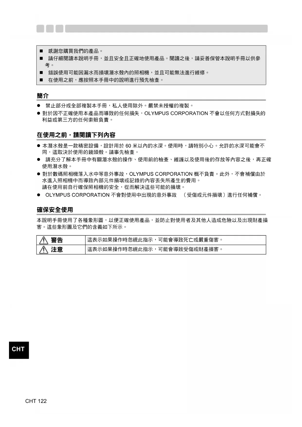z 禁止部分或全部複製本手冊,私人使用除外。嚴禁未授權的複製。 z 對於因不正確使用本產品而導致的任何損失,OLYMPUS CORPORATION 不會以任何方式對損失的 利益或第三方的任何索賠負責。 在使用之前,請閱讀下列內容 z 本潛水殼是一款精密設備,設計用於 60 米以內的水深。使用時,請特別小心。允許的水深可能會不 同,這取決於使用的鏡頭殼。請事先檢查。 z 請充分了解本手冊中有關潛水殼的操作、使用前的檢查、維護以及使用後的存放等內容之後,再正確