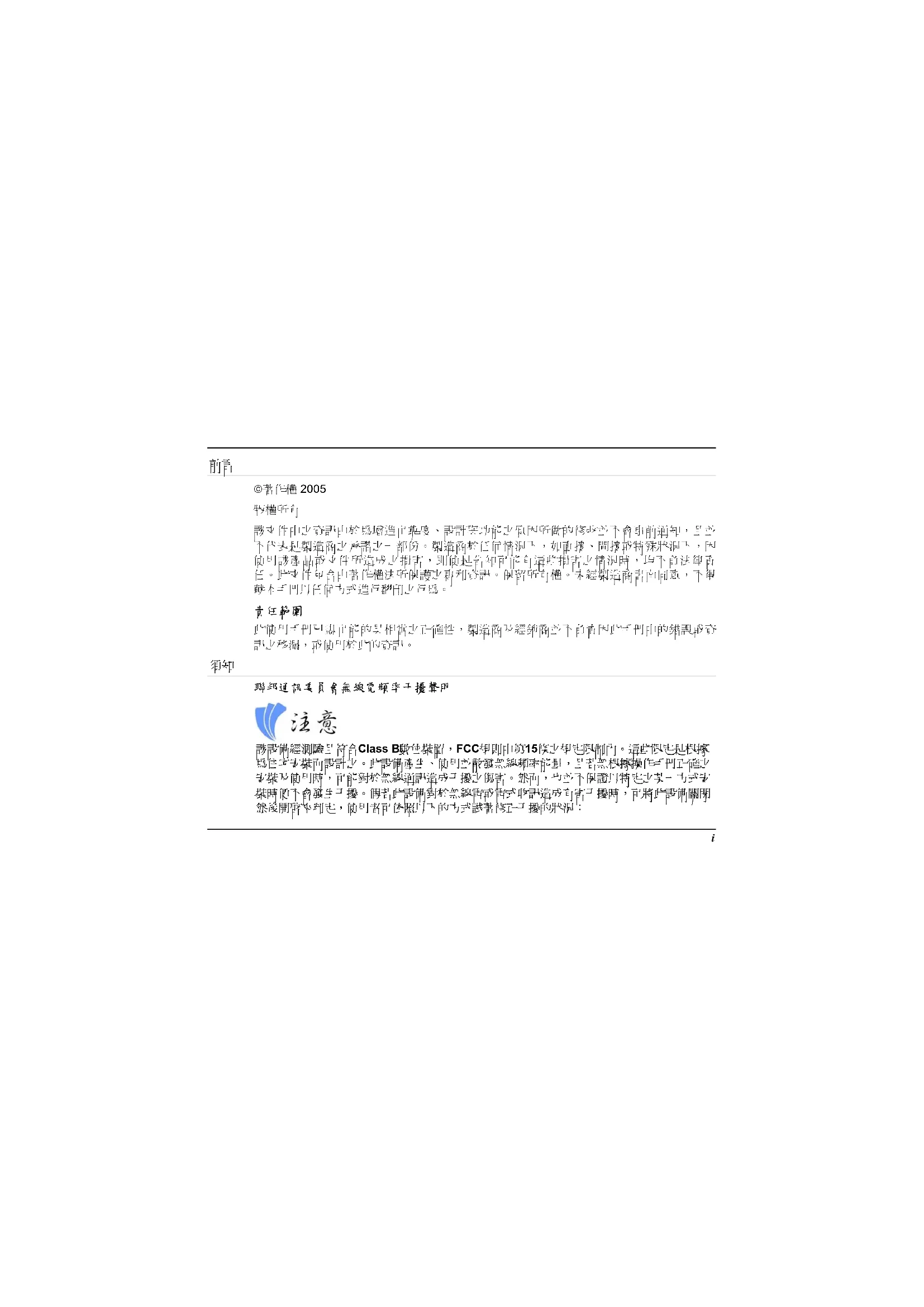聯邦通訊委員會無線電頻率干擾聲明 該設備經測驗且符合Class B數位裝置,FCC規則中第15條之規定限制內。這些限定是根據 為住宅安裝而設計之。此設備產生、使用並散發無線頻率能量,且若無根據操作手冊正確之 安裝及使用時,可能對於無線通訊造成干擾之傷害。然而,也並不保證以特定之某一方式安 裝時便不會發生干擾。假若此設備對於無線電或電式收訊造成有害干擾時,可將此設備關閉 然後開啟來判定,使用者可依照以下的方式試著修正干擾的狀況: