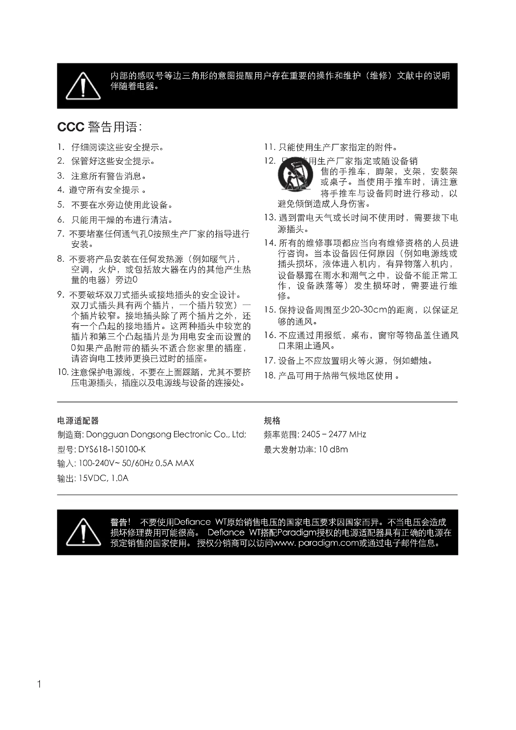 警告! 不要使用Deance WT原始销售电压的国家电压要求因国家而异。不当电压会造成 损坏修理费用可能很高。 Deance WT搭配Paradigm授权的电源适配器具有正确的电源在 预定销售的国家使用。 授权分销商可以访问www. paradigm.com或通过电子邮件信息。2