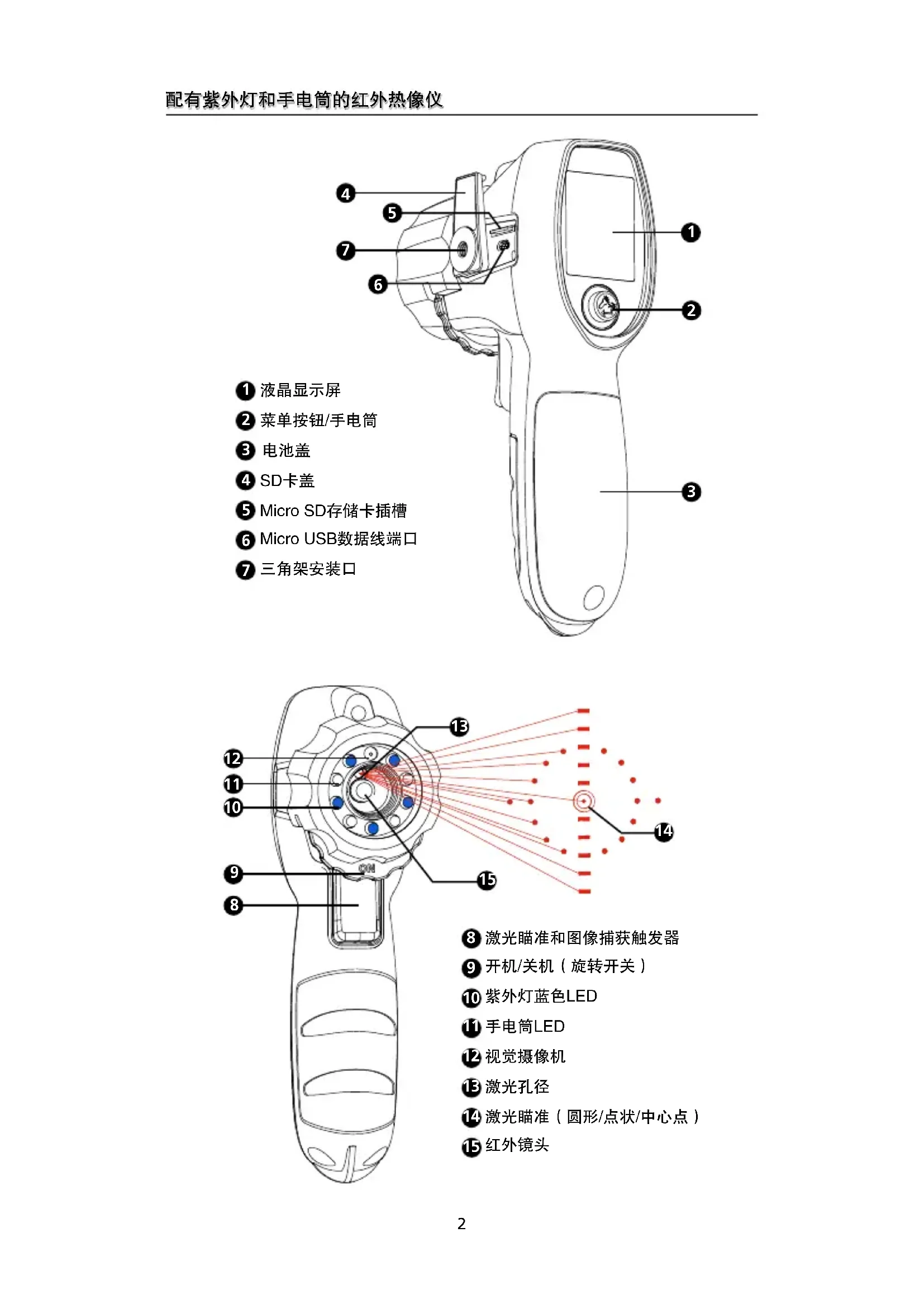 激光瞄准可提供准确的温度测量可见目标。 *使用激光时,请参见第3-4页的“安全信息”。 在菜单上启用激光瞄准后,将导航按钮按至右侧,返回测量模式,并扣动扳柄激活 激光瞄准(见第7页:图像采集/激光瞄准)。10 内存卡/SD卡 图2.4