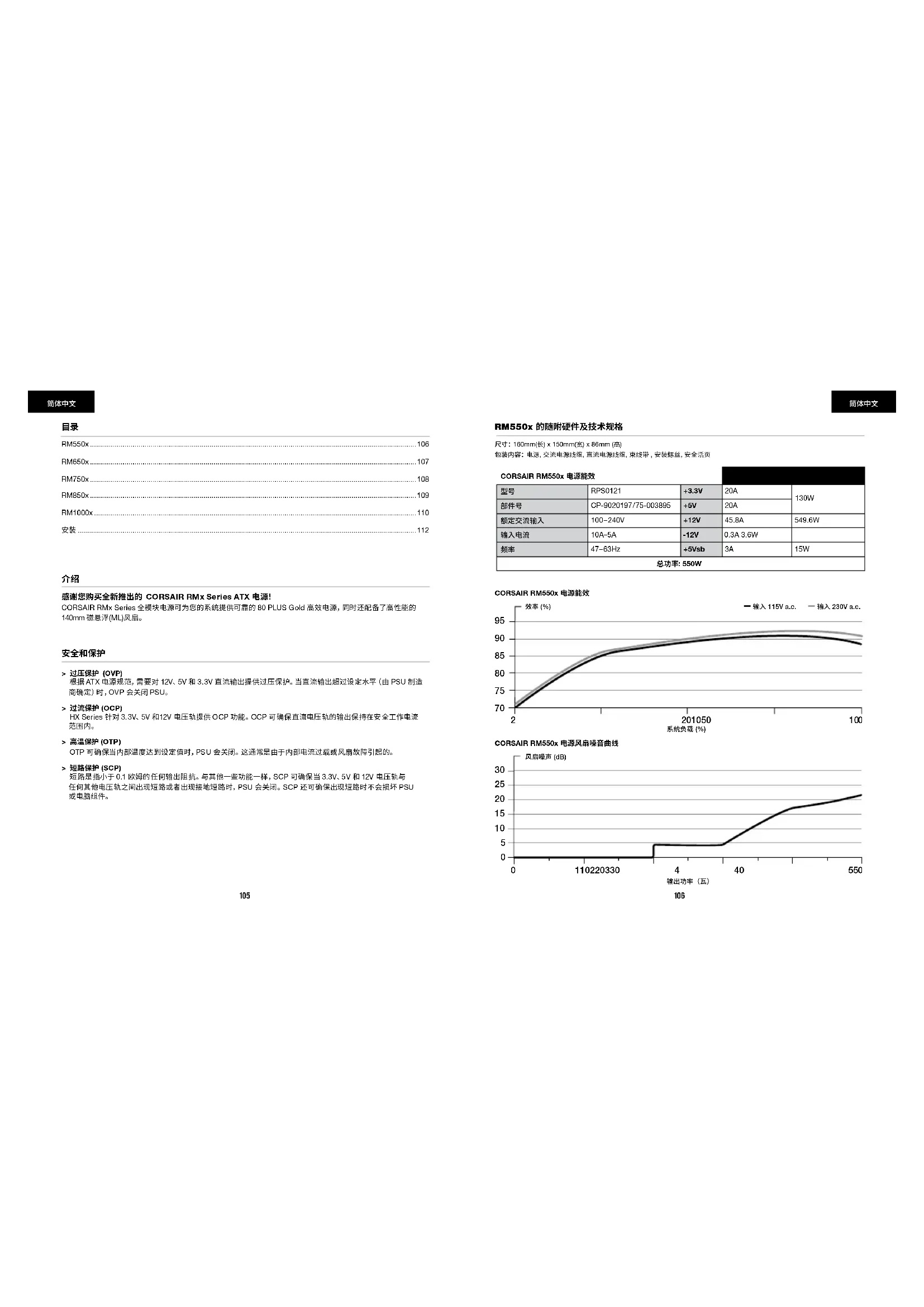 CORSAIR RM550x 电源风扇噪音曲线 风扇噪声 (dB)输出功率(瓦)系统负载 (%)输入 115V a.c.输入 230V a.c.效率 (%) CORSAIR RM550x 电源能效 CORSAIR RM550x 电源能效 最大负载 最大输出