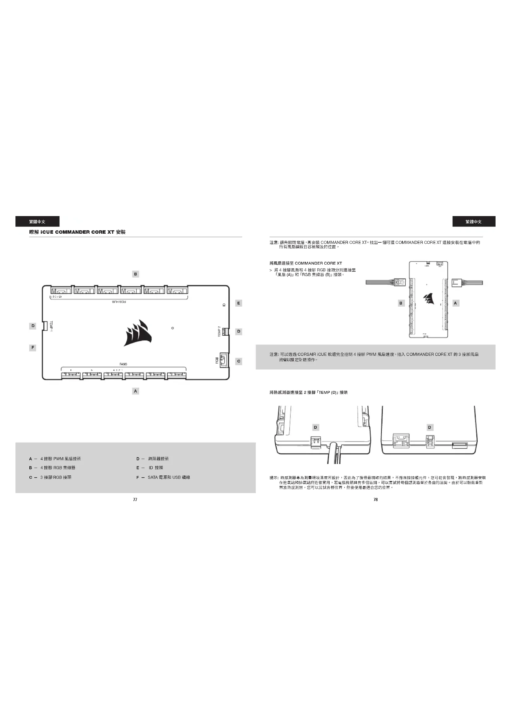 繁體中文 繁體中文了解 iCUE COMMANDER CORE XT 安装 A — 4 引脚 PWM 风扇接头 B — 4 引脚 RGB 集线器 C — 3 引脚接头 D — 热敏接头 E — ID 接头