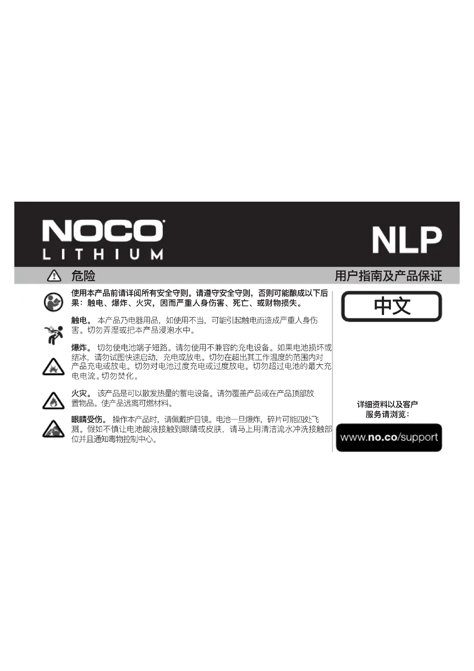 5年:免费。如无购买证明,保修期从序列号日期开始。 我们建议注册您的NOCO产品,以便上传购买证明,延长您的有效保修日期。 您可以在线注册您的NOCO产 品:no.co/register。如果您对保修或产品有任何疑问,请联系NOCO支持部门(上述电子邮件和电话号码)或 致函NOCO公司,地址:30339 Diamond Parkway,#102,Glenwillow,OH 44139 USA。用戶指南及產品保證 使用本產品前請詳閱所有安全守則。請遵守安全守則,否則可能釀成以下後 果: 觸電、爆炸、火災,因而嚴重人身傷害、死亡、或財物損失。 觸電。 本產品乃電器用品,如使用不當,可能引起觸電而造成嚴重人身傷 害。切勿弄濕或把本產品浸泡水中。 爆炸。 切勿使電池端子短路。請勿使用不兼容的充電設備。如果電池損壞 或結冰,請勿試圖快速啟動,充電或放電。切勿在超出其工作溫度的範圍內 對 產 品 充 電 或 放 電 。切 勿 對 電 池 過 度 充 電 或 過 度 放 電 。切 勿 超 過 電 池 的 最 大