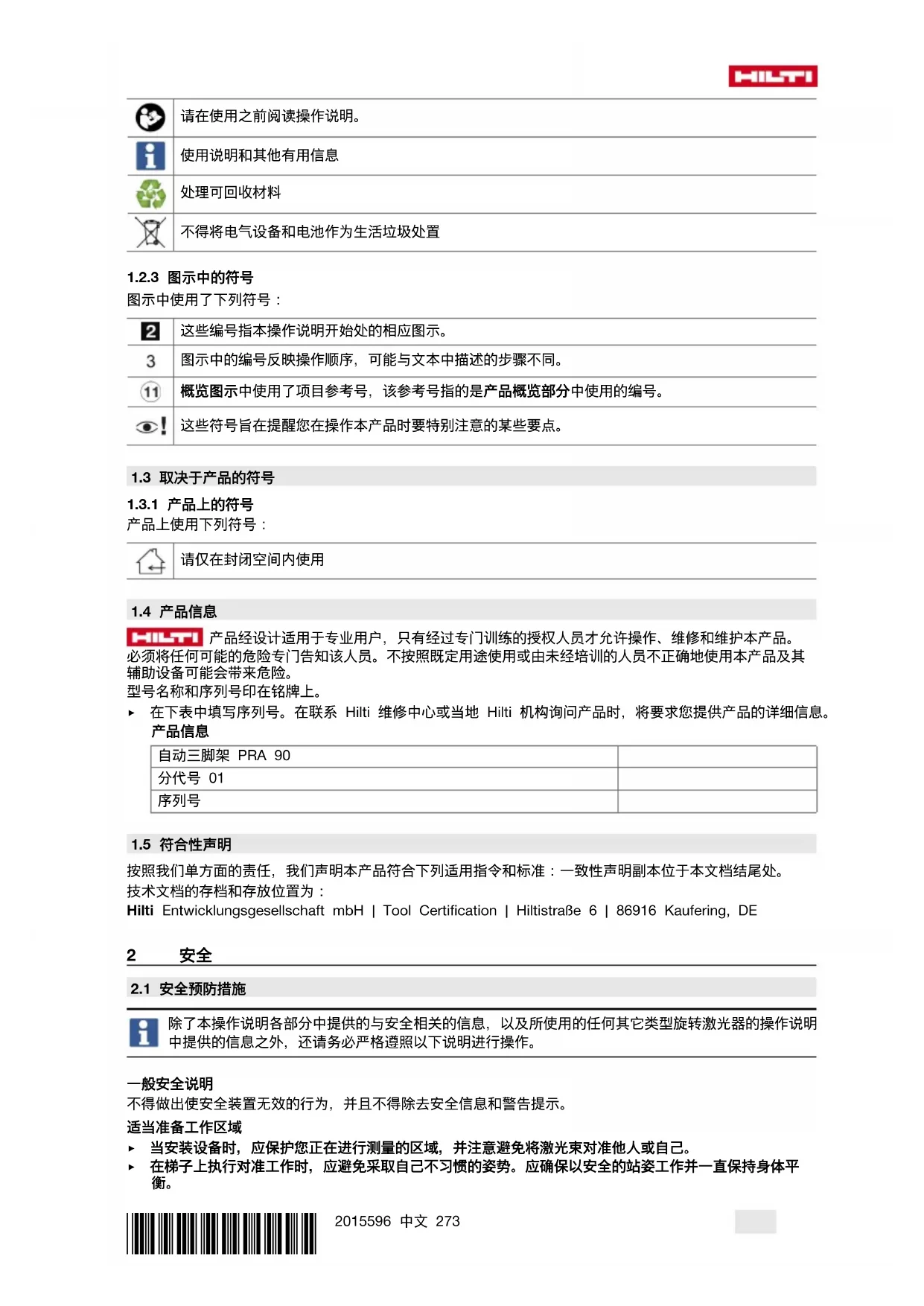 本文档中使用下列符号:*2015596* 2015596 中文 273 请在使用之前阅读操作说明。 使用说明和其他有用信息